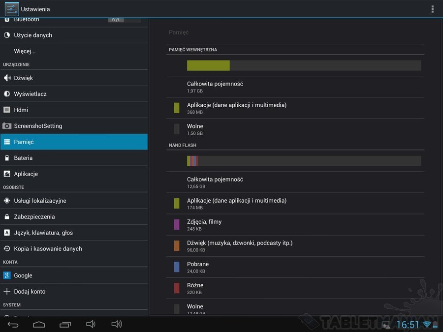 Widzialem ten tablet na zywo i zastanawia mnie czemu wspomniale 16GB pamięci podzielone jest na 2GB na pamięć wewnetrzna, gdzie instalują się aplikacje, i na 12,65GB na pamięć nand flash. Tak wiec nie wiem jak to dokładnie jest, ale jeżeli mamy tylko 2GB na własne aplikacje to trochę mało. Przeciez sa gry co zajmują po 1GB i więcej. Dlaczego nie mamy jednej pamięci kilkanaście GB gdzie możemy instalować gry itp.