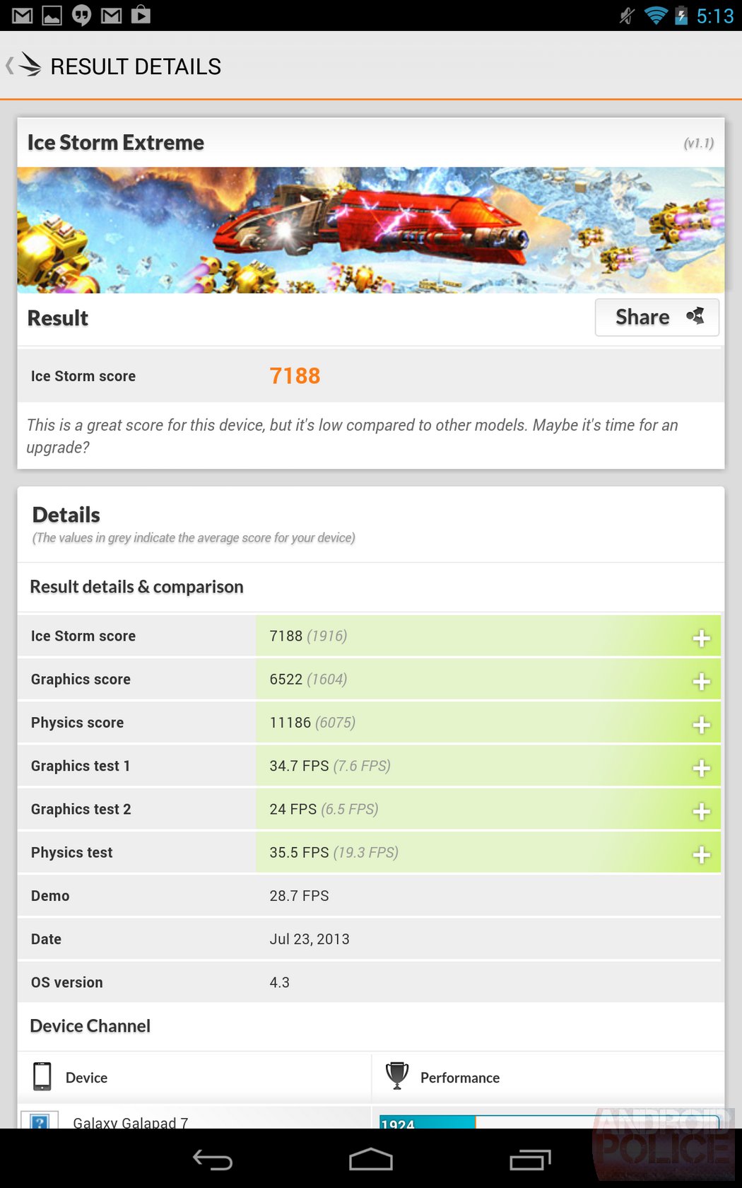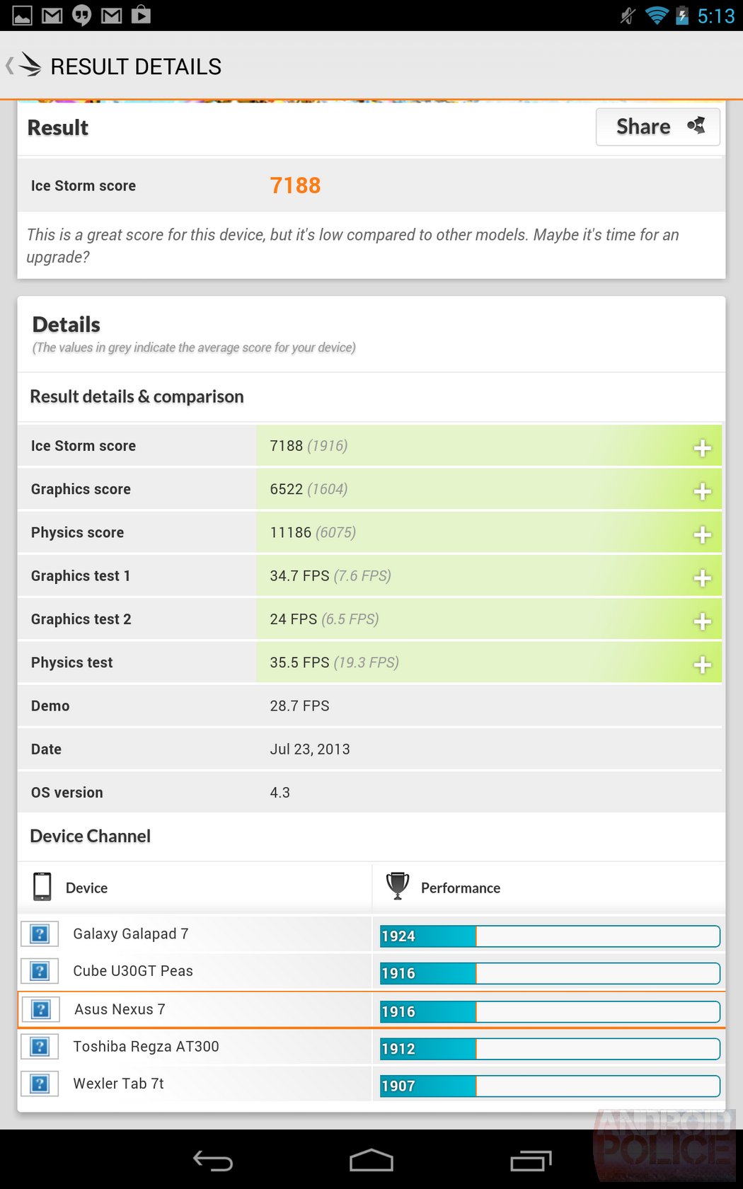 Podsumowanie w 3DMarku doskonale podsumowuje ten tablet. Ale jest i pozytywna strona słabego S4 Pro – producenci w końcu zoptymalizują pod niego gry i na Nexusie 4 wszystko będzie lepiej wyglądało 😀