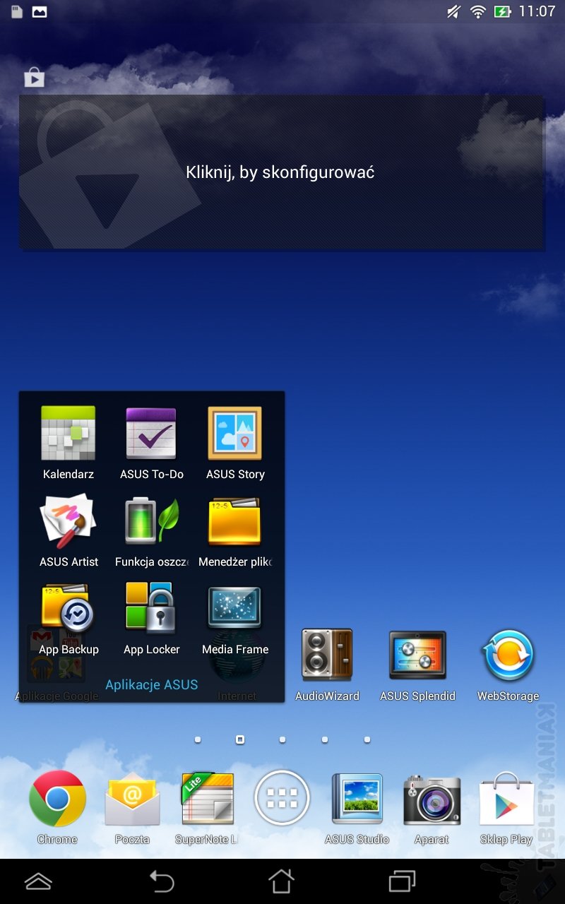 Pakiet aplikacji preinstalowanych przez ASUSa jest całkiem użyteczny; to ten sam zestaw, o którym pisałem przy okazji testu Fonepada, również siedmiocalowego, ale wzbogaconego o modem 3G i funkcję telefonu. W MeMO Padzie znajdziemy m.in. ASUS Studio, ASUS Story, BuddyBuzza, SuperNote Lite czy wreszcie prosty program do rysowania. Część z tych tytułów faktycznie można wykorzystać, choć tu i ówdzie trafi się również coś w rodzaju bloatware’u.