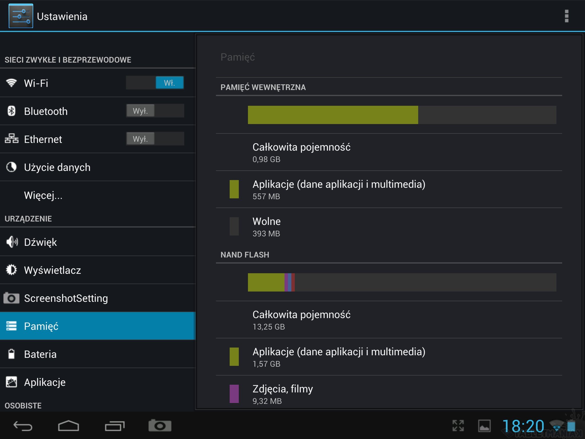 Po podłączeniu MID 9712 do komputera otrzymacie możliwość wyboru trybu MPT lub pamięci masowej. Skoro już przy tej ostatniej jesteśmy, Omega ma do zaoferowania 16 gigabajtów pamięci, z czego przeszło dwa zajęte są przez pliki systemowe. Rolę pamięci wewnętrznej spełnia natomiast przestrzeń równa 0,98 GB. Na kartę microSD możliwe jest przenoszenie tylko niektórych aplikacji.
