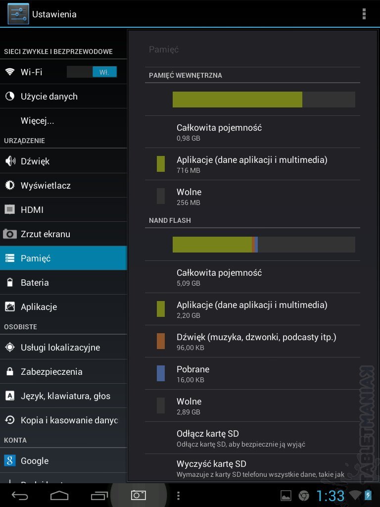 Tablet oferuje osiem gigabajtów przestrzeni dyskowej, z czego dla użytkownika dostępnych jest trochę ponad pięć. Rolę pamięci wewnętrznej spełnia 0,97 GB.