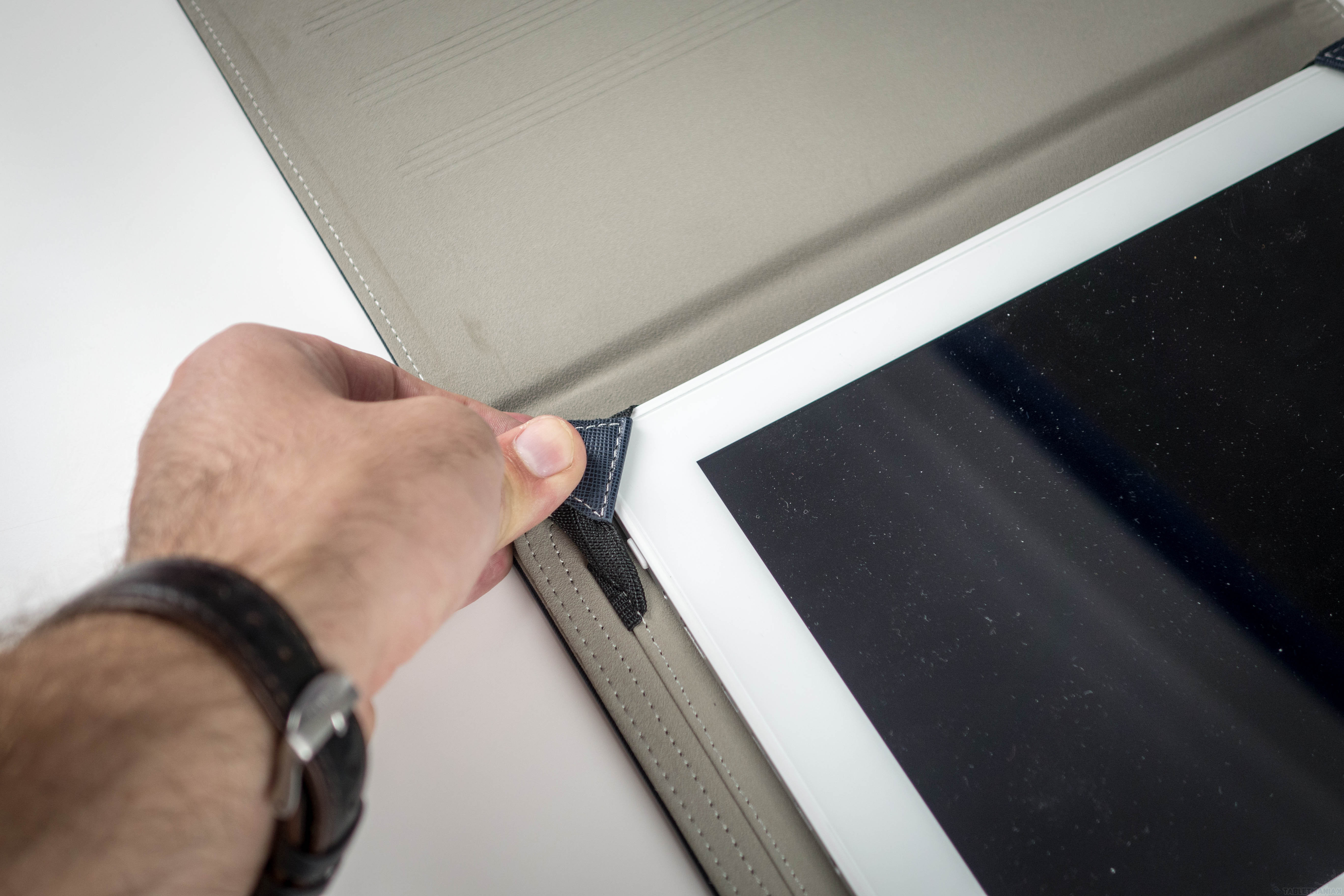 Przyszedł czas włożyć do naszego pokrowca jakiś tablet. Do testów dostaliśmy dwa rozmiary, nie odbiorę sobie więc też przyjemności zrecenzowania wersji dla „siódemek”. Mówiąc o montażu urządzenia, nie wyobrażam sobie, by ktoś się w tym nie połapał i pytał „o co tu właściwie chodzi?”. W „dużym” modelu dostajemy z jednej strony szerokie, łatwiej rozciągające się gumki przyozdobione kawałkiem sztucznej skóry w kolorze etui, podczas gdy z drugiej czeka na nas podwójny zestaw takich samych, ale o połowę węższych i mniej rozciągliwych gumek. Wersja 7″ przeznaczona jest dla jednego typu tabletów, przytrzymywać je będą więc cztery mniejsze paski, takie same jak w wersji dla 10″. Umieszczenie tabletu w takim „gnieździe” jest dziecinnie proste, a jednocześnie uchwyt jest pewny – nie ma strachu o przypadkowe wypadnięcie sprzętu.
