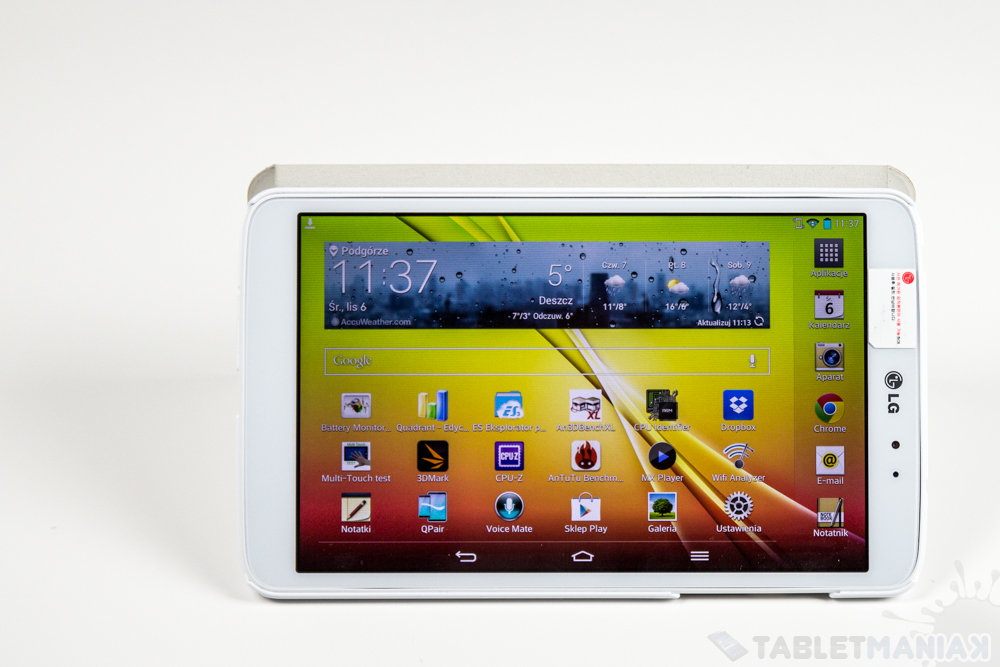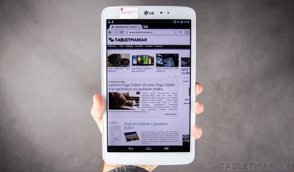 Stosunek boków 16:10 pozwolił producentowi na implementację matrycy IPS o rozdzielczości 1920 x 1200, co przy 8,3-calowej przekątnej przekłada się na gęstość 273 PPI. LG samo chwali się, że nie uzyskamy tu przesyconych, cukierkowych kolorów znanych z paneli AMOLED, co akurat uważam za zaletę. Podobnie jak w G2, tak i tutaj otrzymujemy barwy naturalne, z doskonale wyważonym balansem bieli. Od strony reprodukcji kolorów to jeden z najlepszych ekranów na rynku.