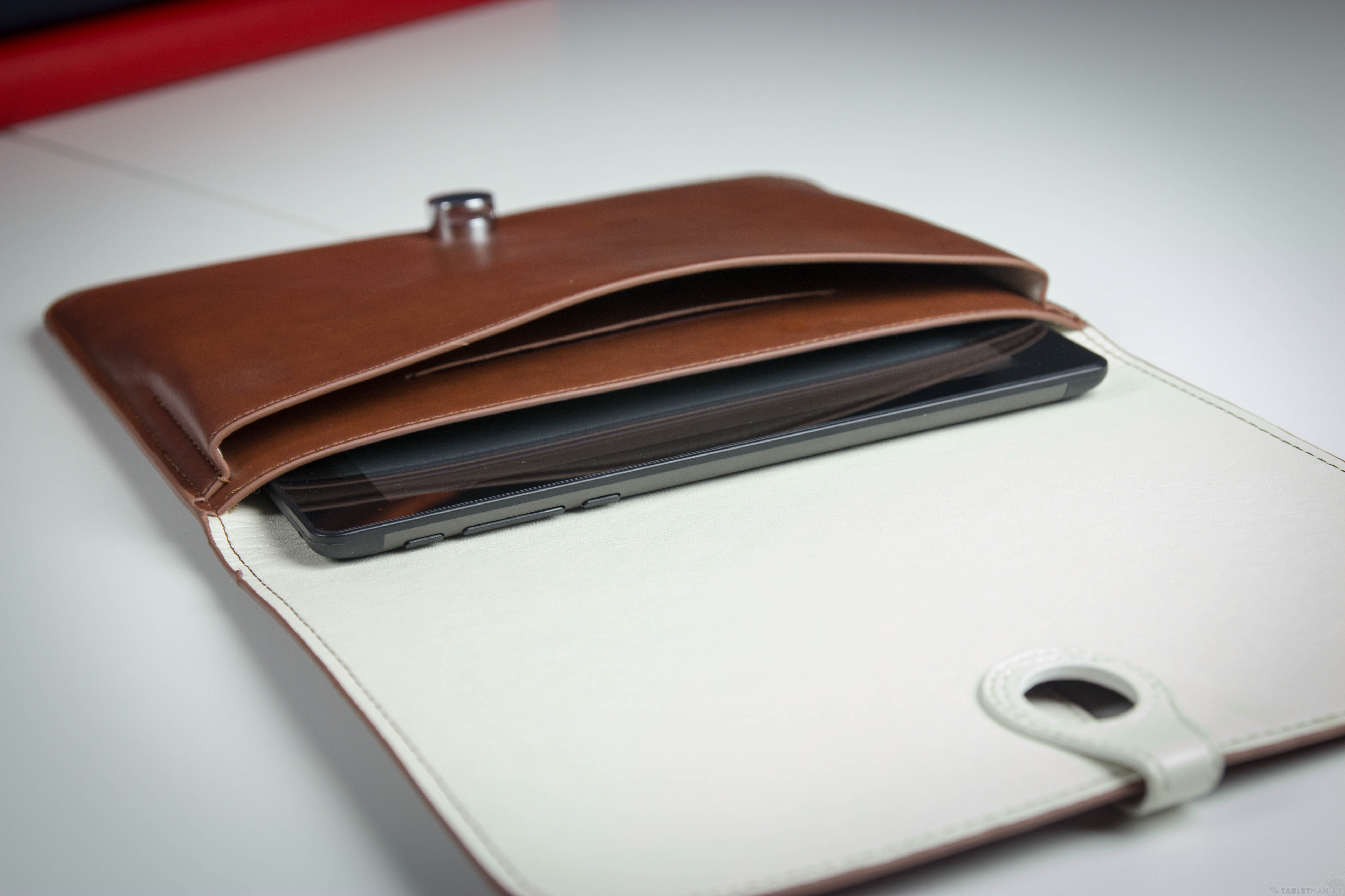 Kiano Pocket to z kolei jedno z najbardziej eleganckich etui w zestawieniu. Może nie jest to typowa wsuwka, ale jego funkcja de facto do tego właśnie się ogranicza. Wygląda jak torebka kopertowa z brązowej skóry i z kontrastowym, białym paskiem wchodzącym w wypolerowany metalowy guzik jako zapięcie.