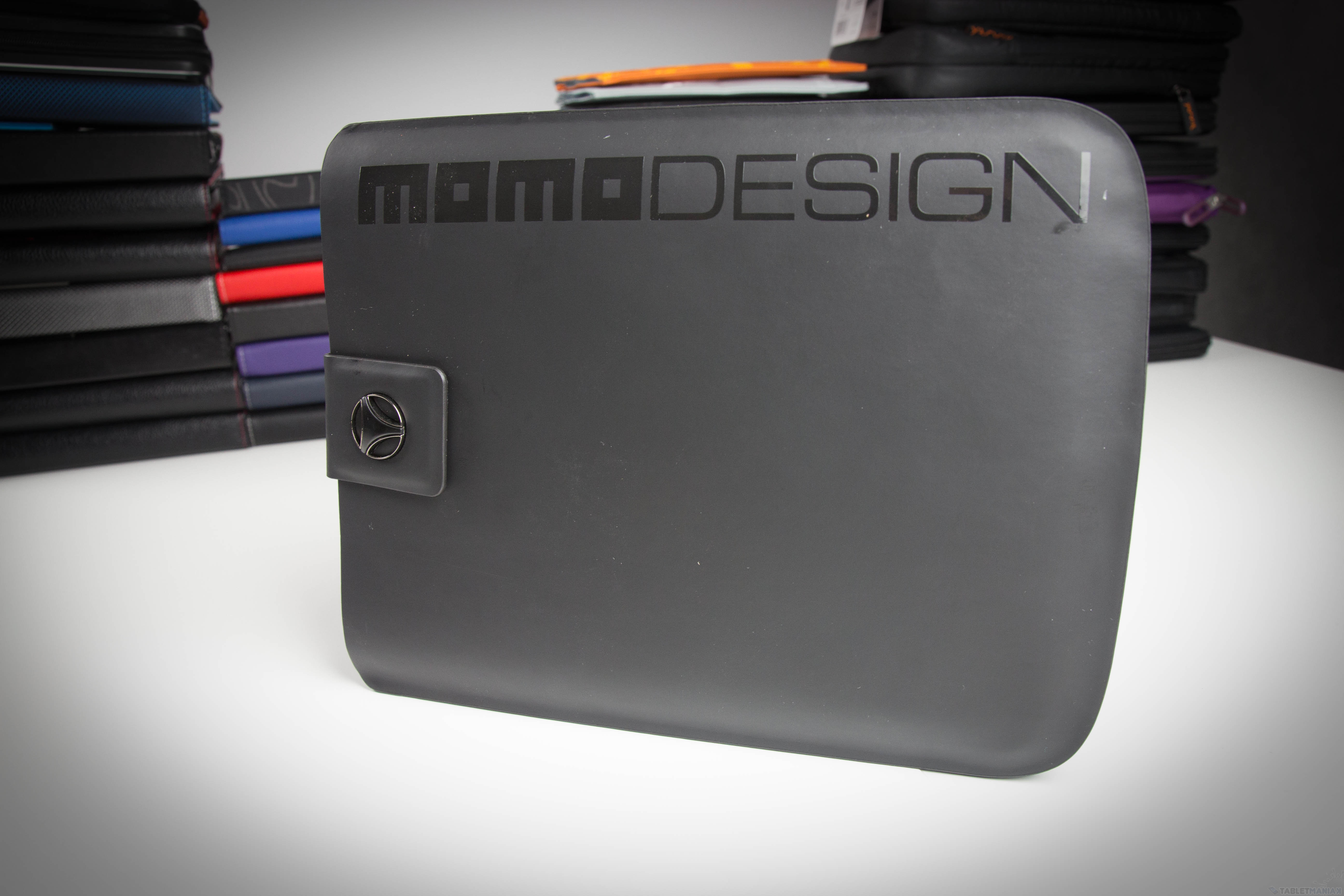 Trzeba przyznać, że wsuwka wygląda naprawdę ładnie. Z zewnątrz mamy do czynienia z gładką gumą, na której znalazł się błyszczący napis „MOMO DESIGN”. Na górze pokrowca pojawił się za to zaczep na magnes z logo studia designu przypominającym trójramienną kierownicę. W środku oczywiście znalazła się jakaś miękka wyściółka.