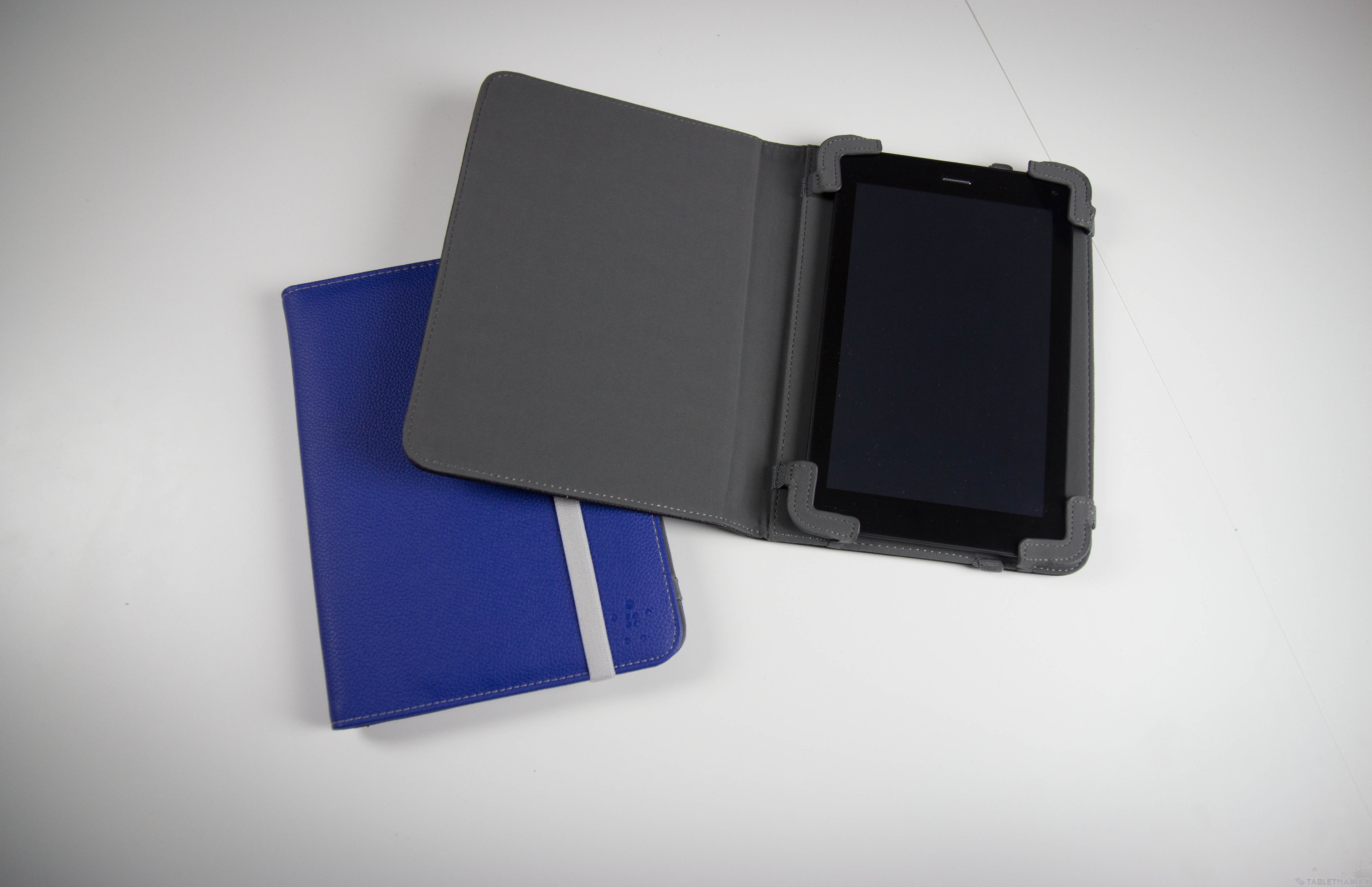 Otóż okładkę etui możemy zawinąć pod spód, zaczepiając przy tym z tyłu magnes, by przypadkiem etui się nie odwijało. Środek wyłożono antypoślizgowym materiałem przypominającym kauczuk, gumę czy coś pomiędzy. Mam jednak spore zastrzeżenia co do uchwytów w środku – jak widzicie na zdjęciu, włożyłem do niego tablet 7″, taki też jest maksymalnym rozmiarem, jaki „przyjmie” Belkin. Problem w tym, że tablet ten powinien być szerszy – w takim uchwycie leży bardzo niepewnie i w zasadzie nie przychodzi mi do głowy jakiś konkretny model, który mógłby tu pasować – producent wymienia za to m. in. Blackberry PlayBook, Samsung Galaxy Tab 2, HP Slate7 i Lenovo IdeaTab A2107 jako kompatybilne i pewnie z nimi pokrowiec ten ma sens – jednak z naszym 7″, a tym bardziej 7.65″ Belkin nie współpracuje.