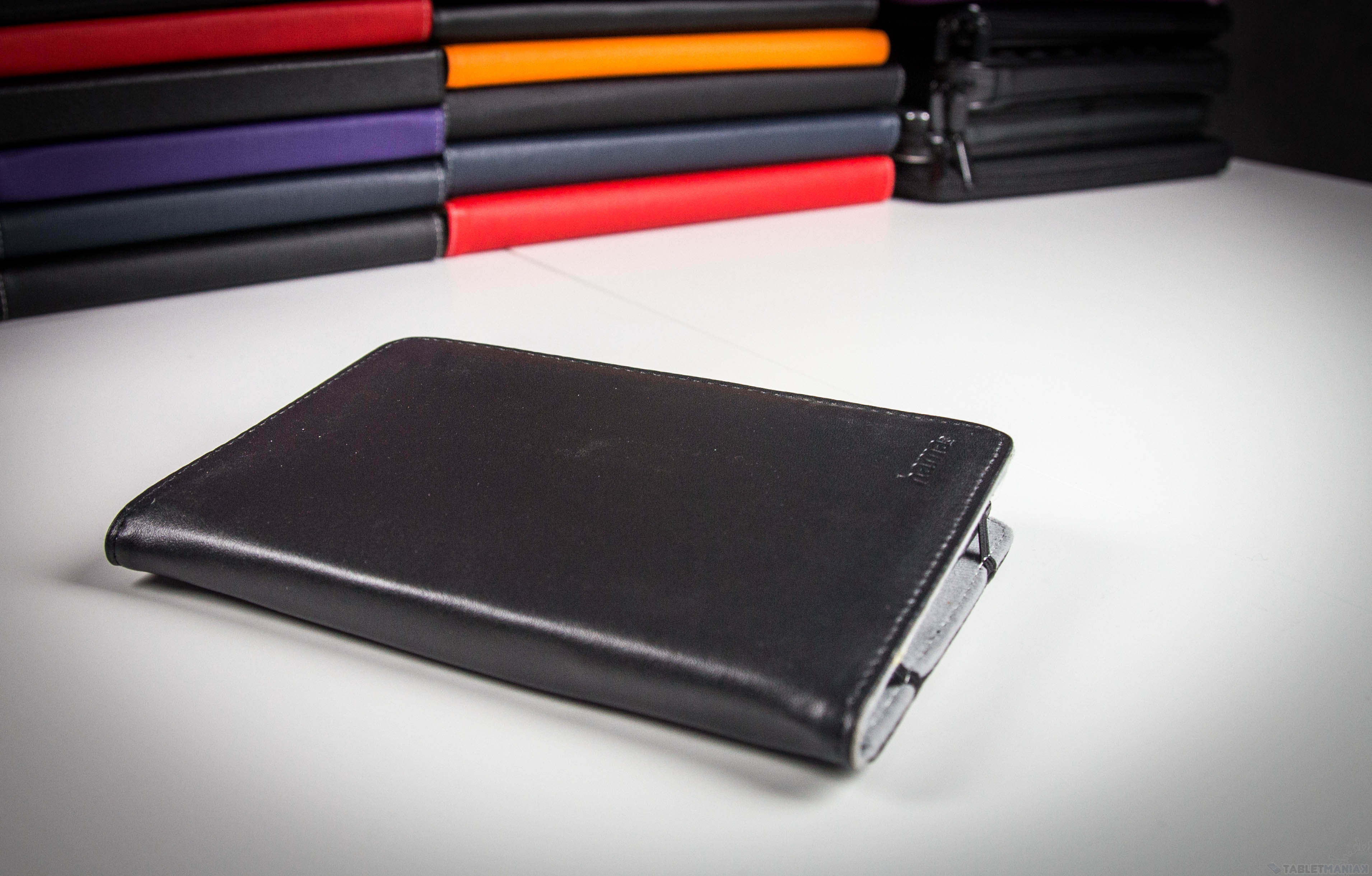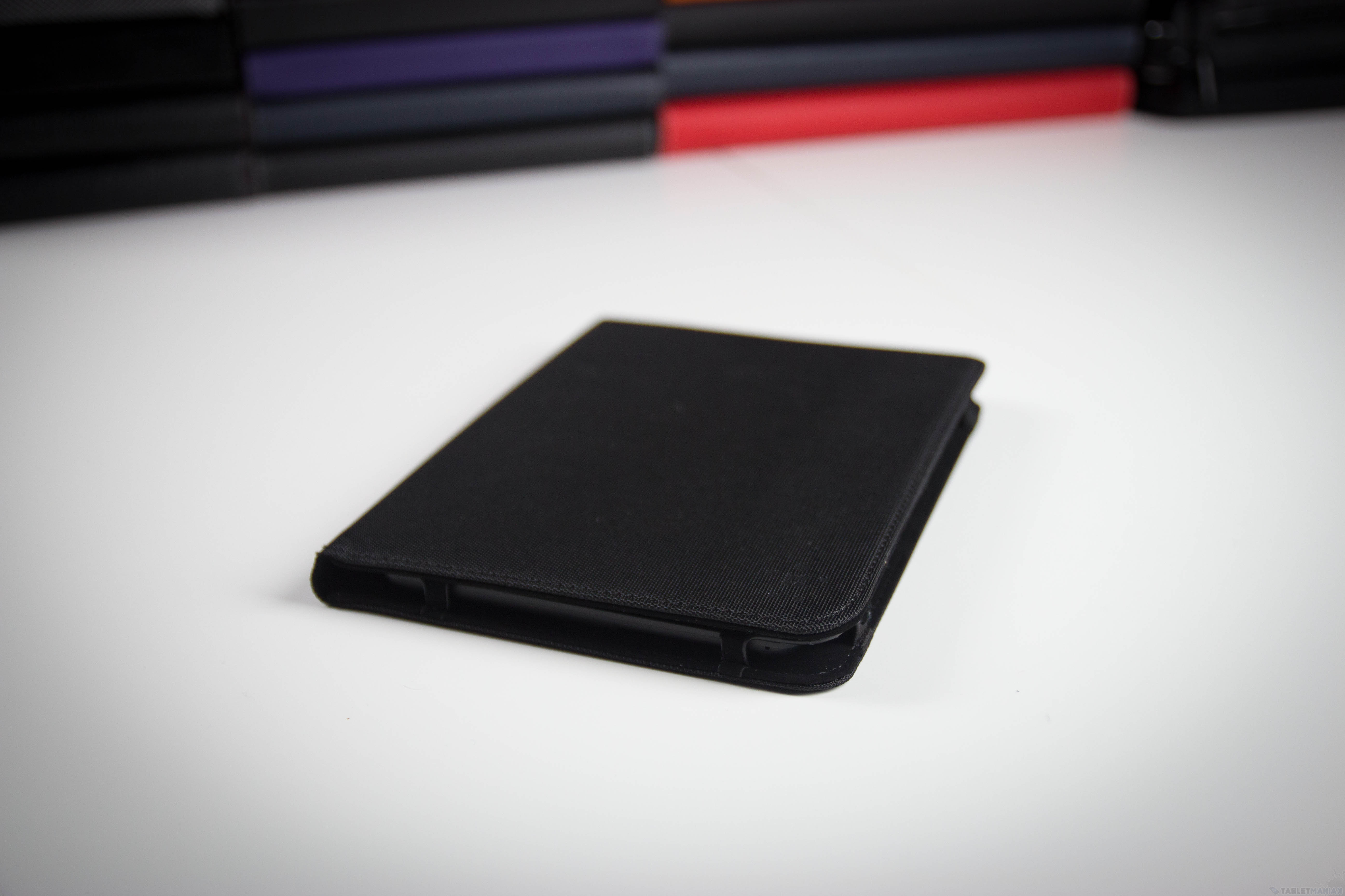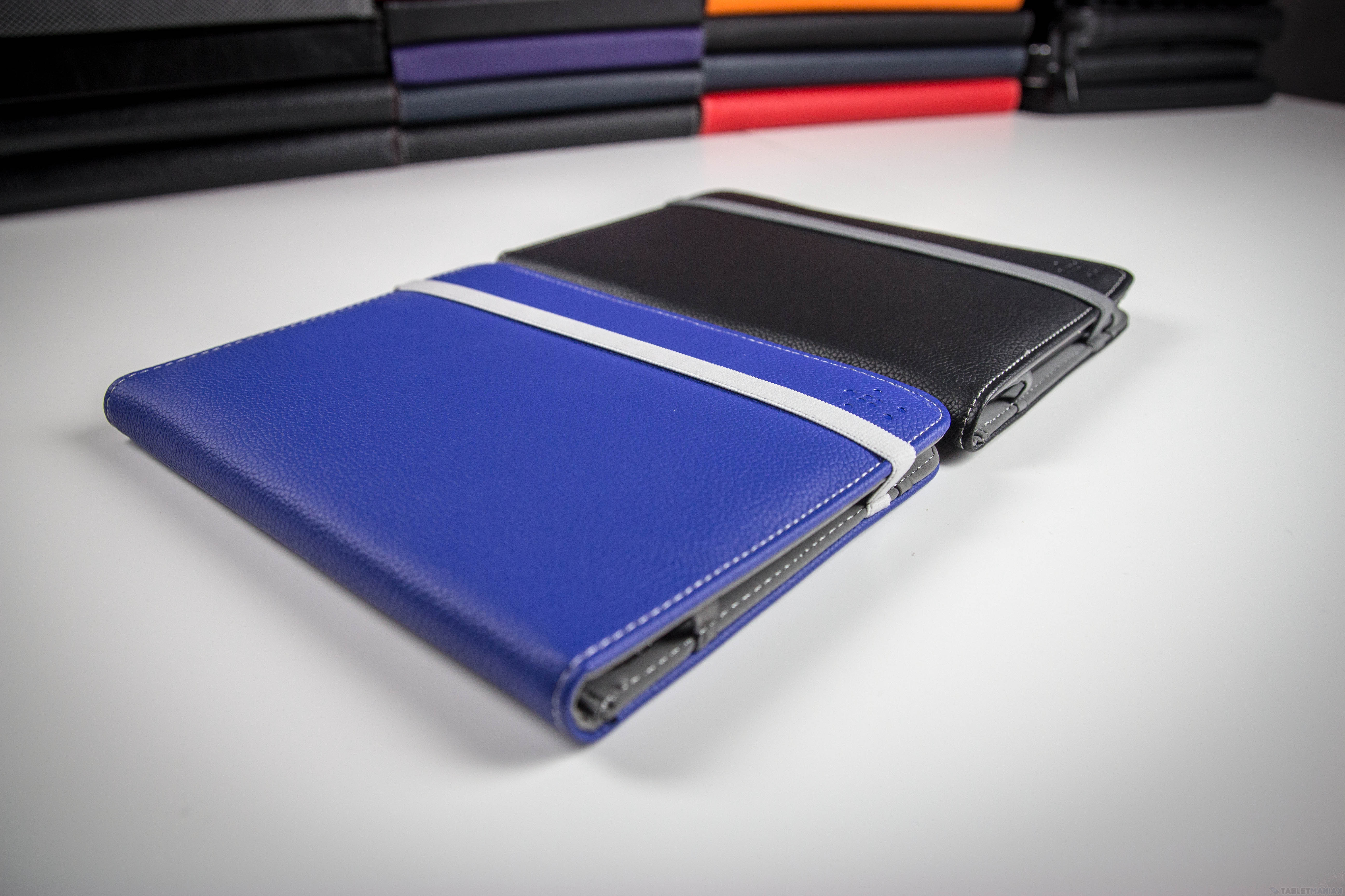 Kolejny Belkin. Strap to w zasadzie bardzo podobne do Verve etui – różnice są tak naprawdę kosmetyczne. Zewnętrzna część wykonana jest z kolorowego materiału przypominającego sztuczną skórę, ale o grubszym ziarnie niż w Verve. Największą różnicą jest chyba sposób zamykania, który w tym wypadku jest elastycznym paskiem, takim jak znajdziemy czasem w notatnikach – możemy go wykorzystać do tego samego co zaczep na magnes – zawinąć etui do tyłu i założyć pasek, by pracować w pozycji poziomej.