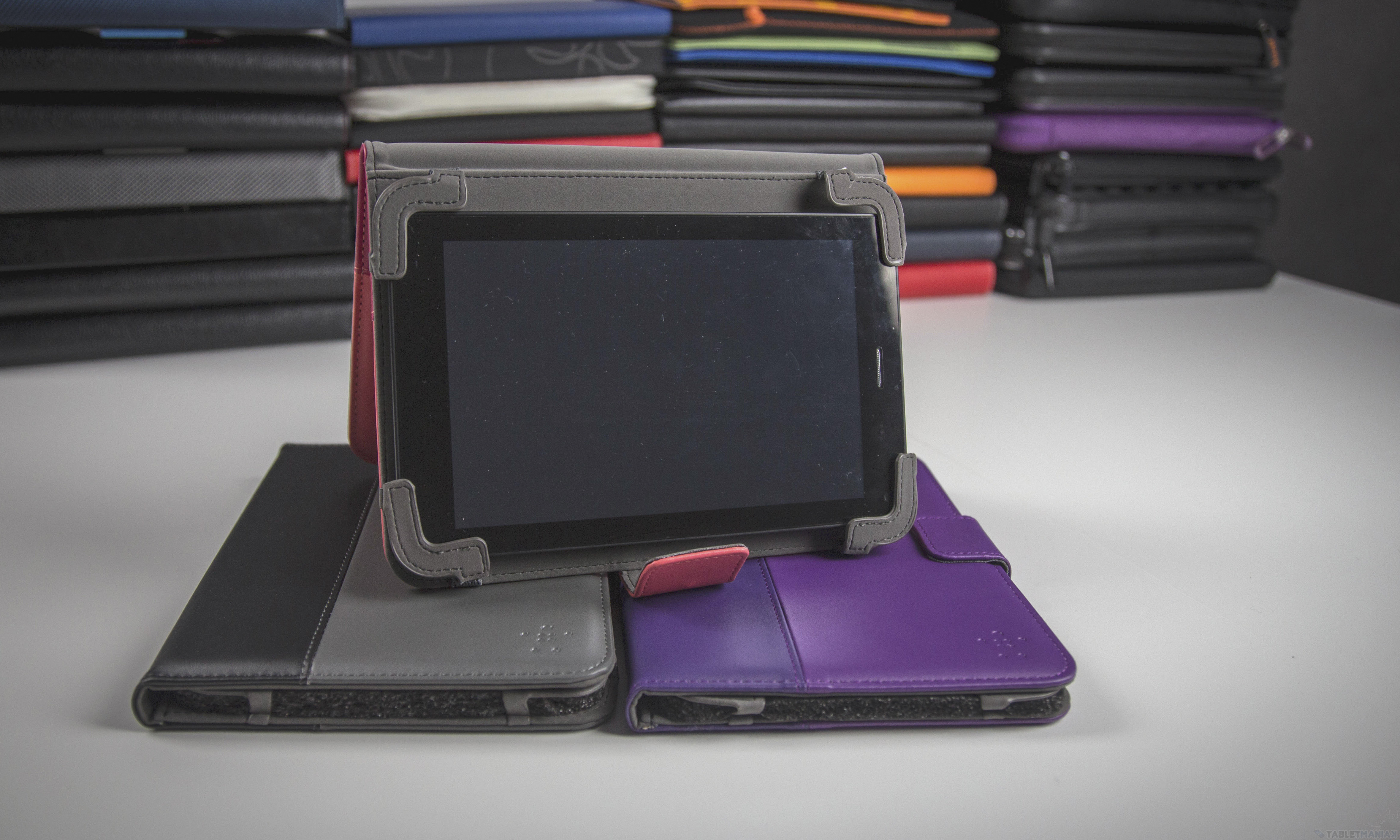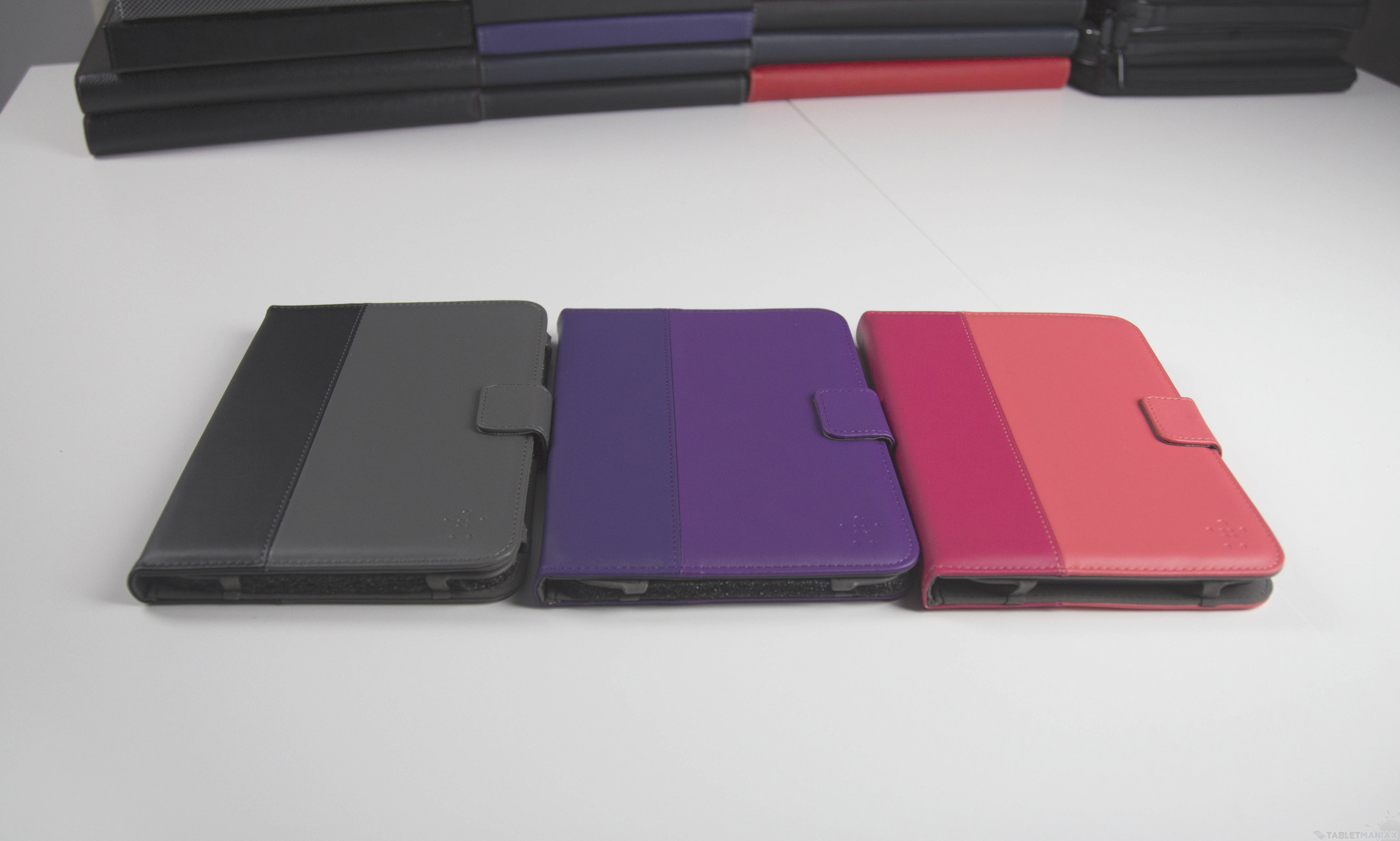 Przegląd „książek” otworzy Belkin z modelem Verve dla tabletów o maksymalnej przekątnej 7 cali. W redakcji model ten pojawił się w trzech kolorach – szarym, różowym i fioletowym. Wykonanie nie pozostawia wiele do życzenia – zastosowano tu sztuczną skórę w dwóch odcieniach, a połączenie to wygląda całkiem oryginalnie. Model ten posiada też pasek z magnetycznym zaczepem z obu stron. Dlaczego z obu?