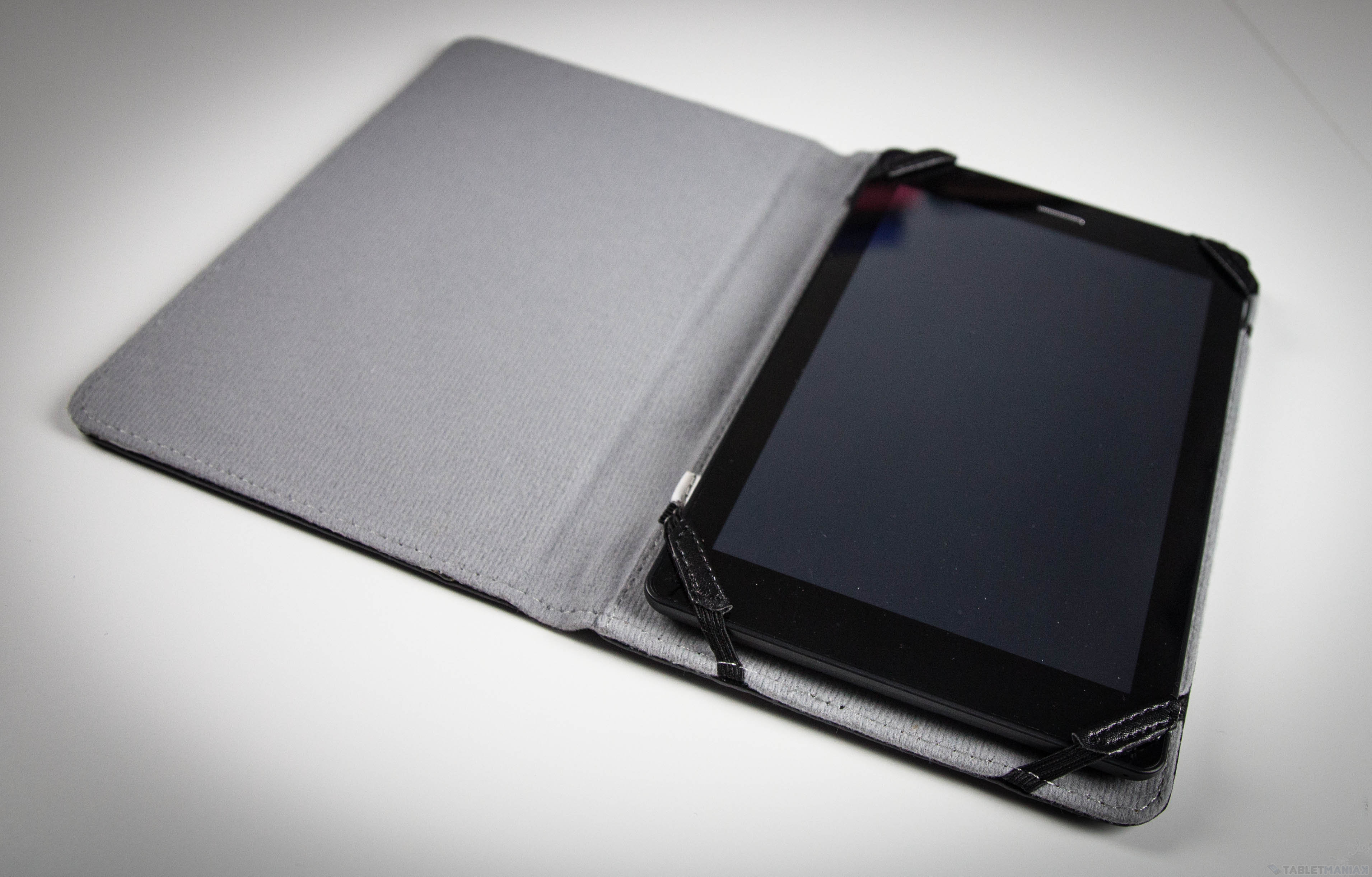 W środku zastosowano materiał podobny do tego, z jakiego robi się woreczki na okulary. Tablet mocujemy czterema rozciągliwymi paskami z ozdobą w kolorze okładki. Tablet 7″ trzymał się całkiem pewnie, ale paski są chyba trochę za cienkie – przy mniej delikatnym użytkowaniu mogą się zerwać, a wtedy etui będzie bezużyteczne – nie wciskałbym tutaj też nic większego, ani mniejszego niż 7 cali – z tych samych względów.