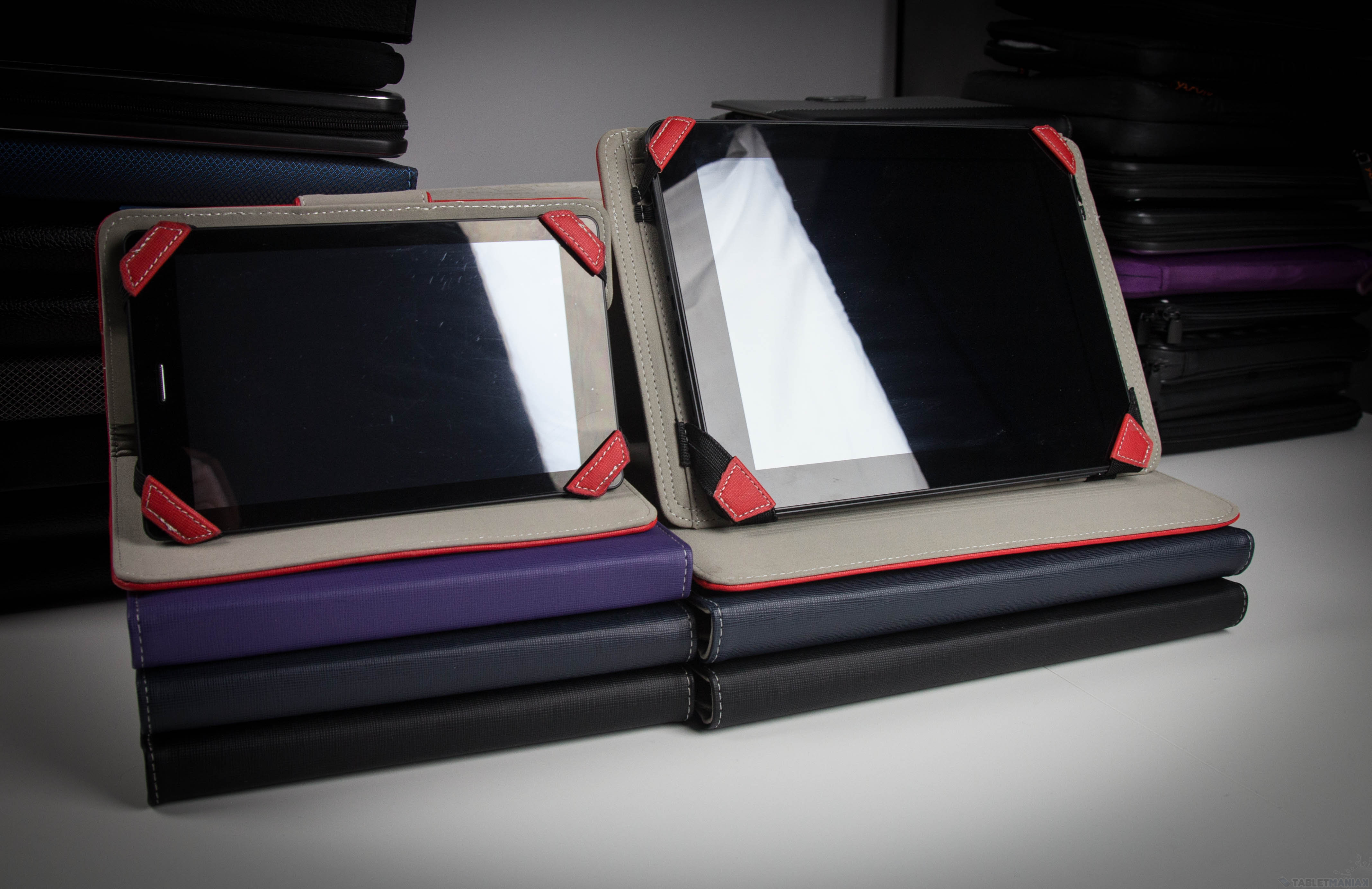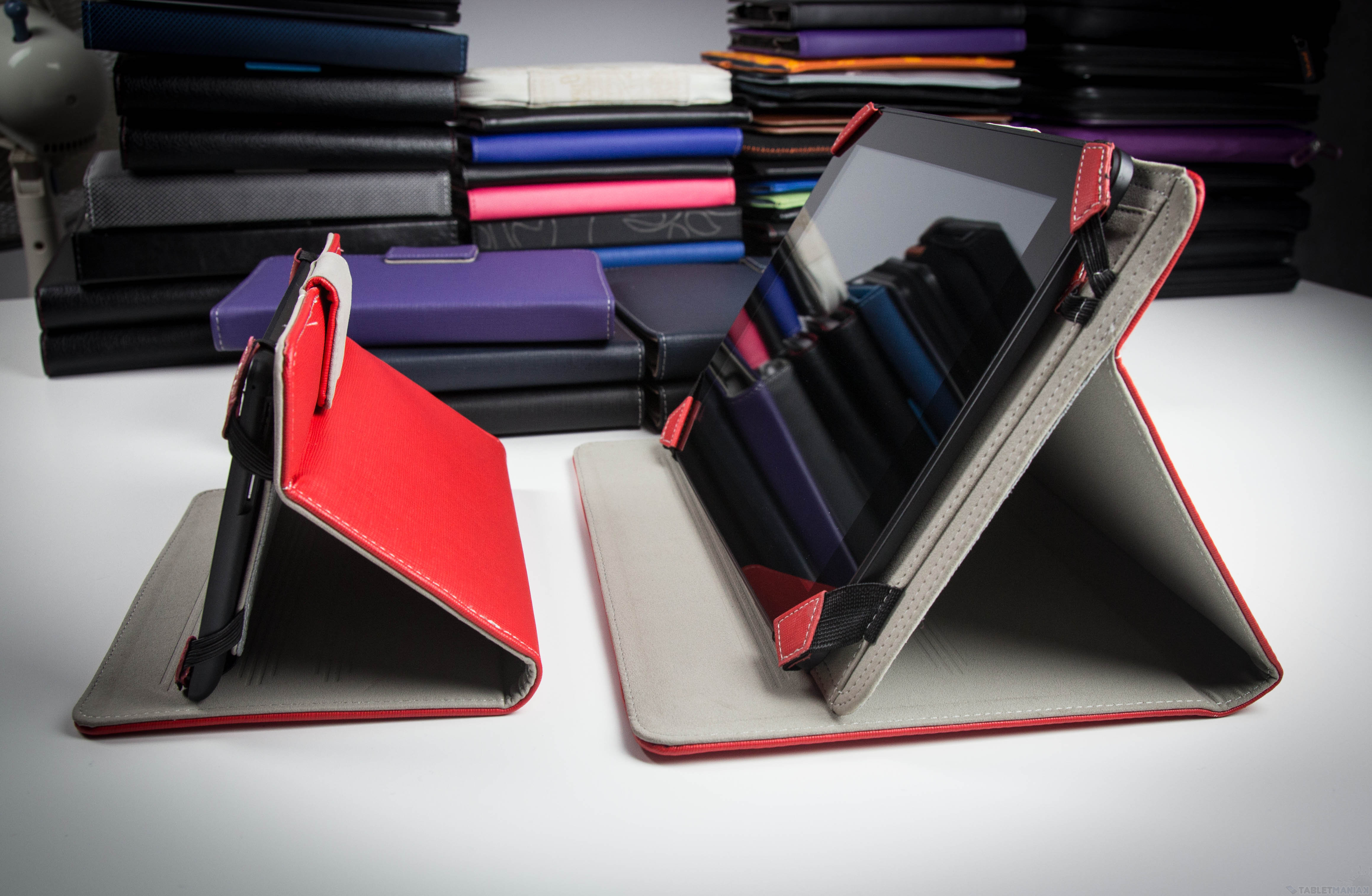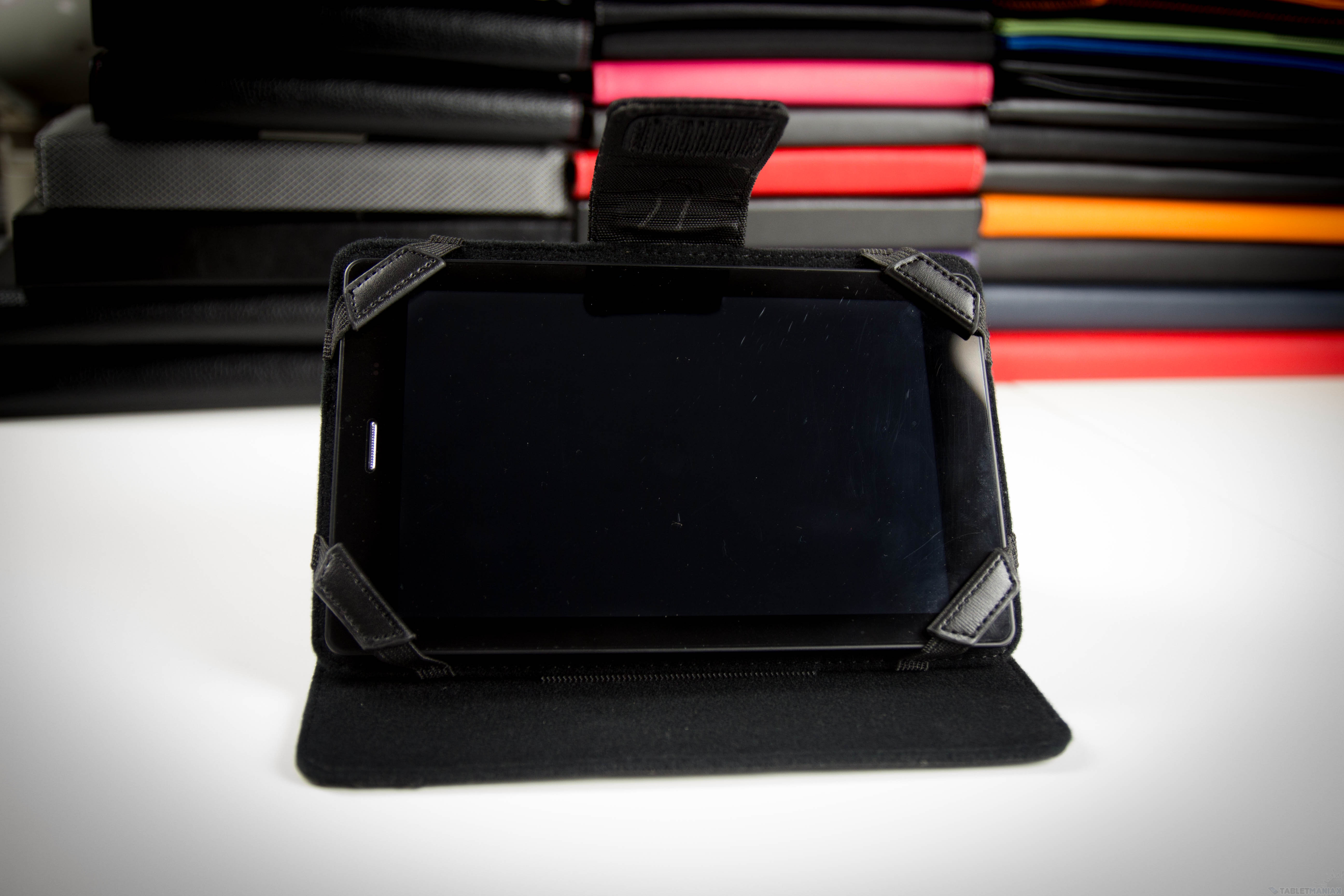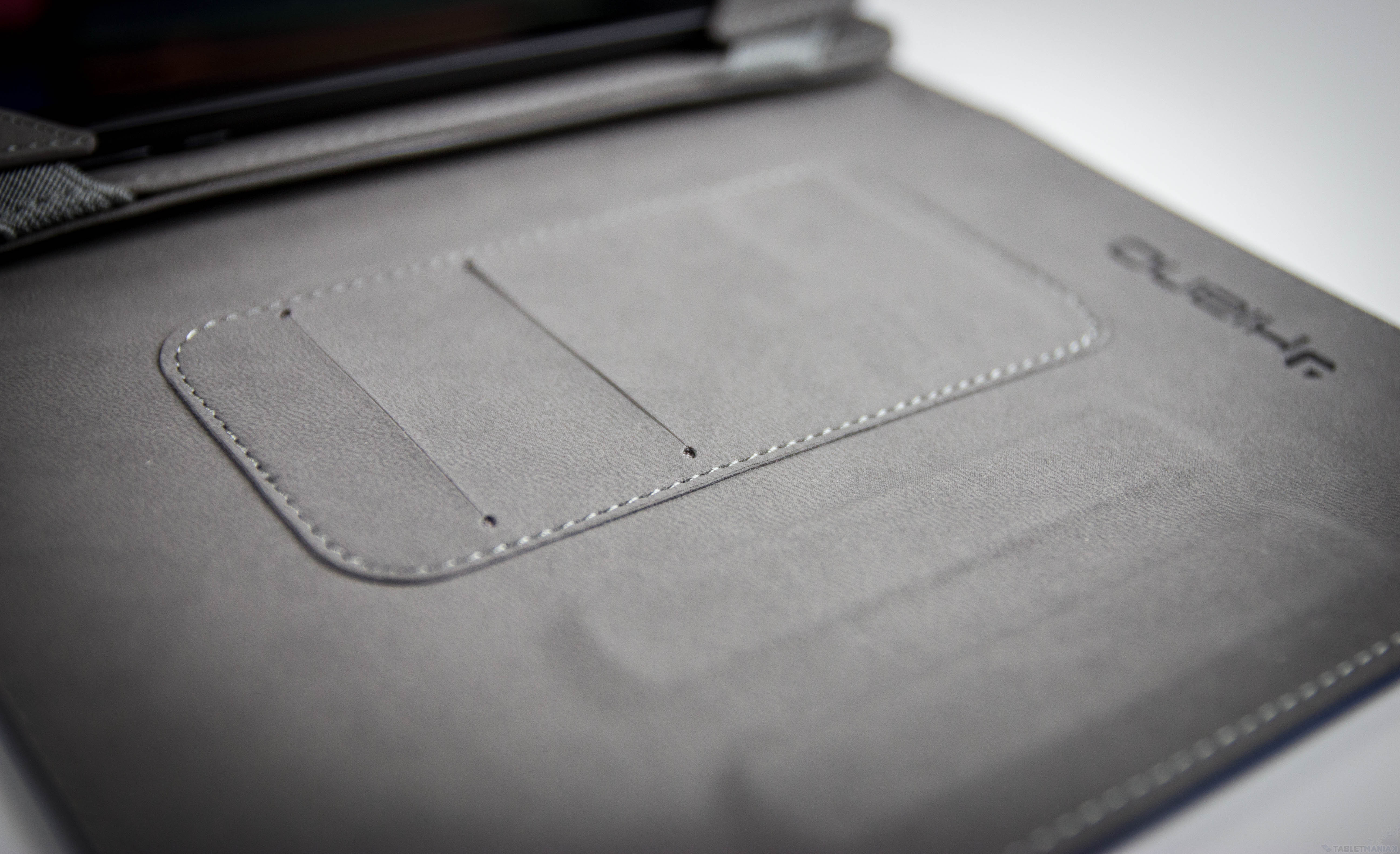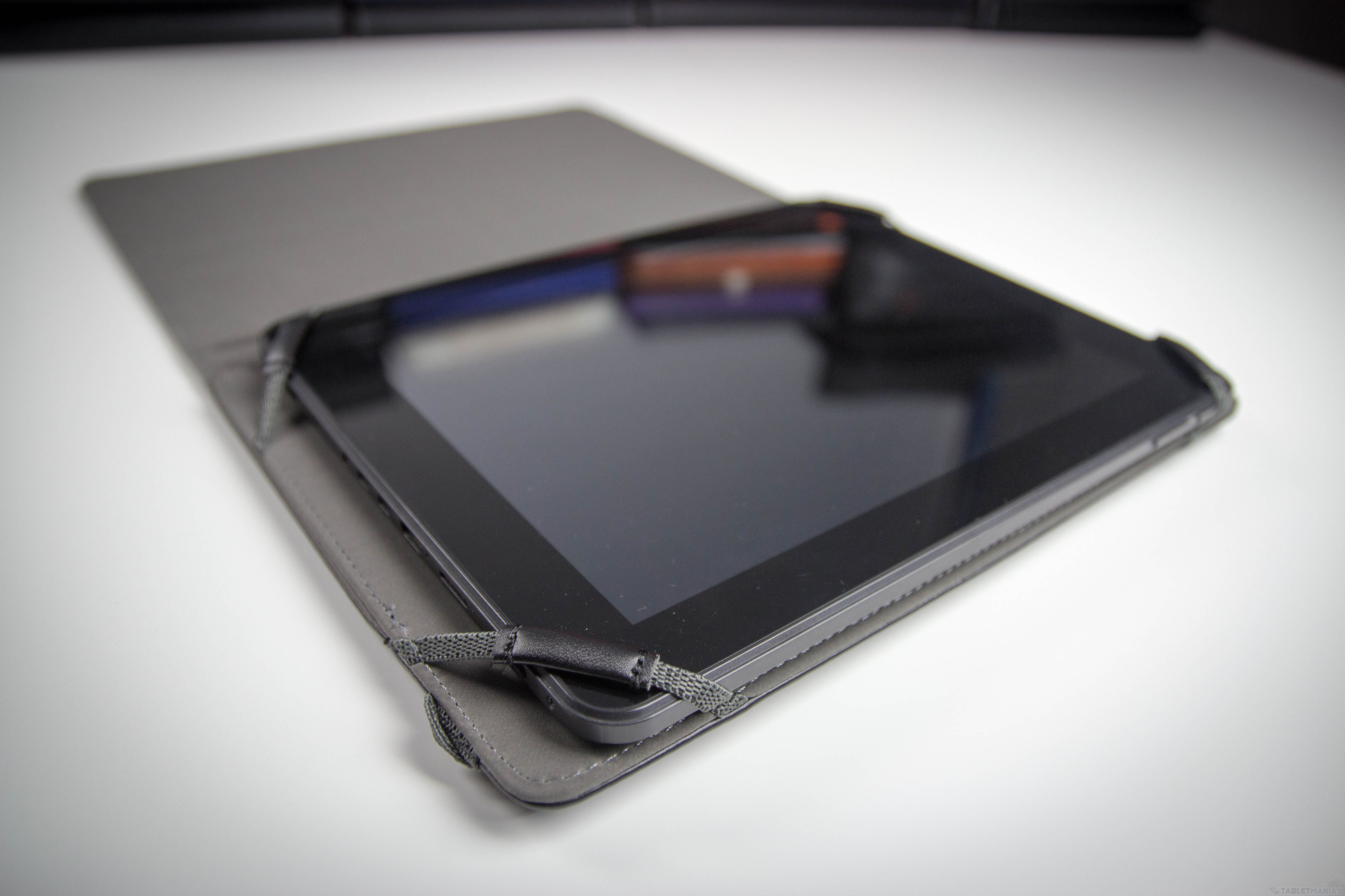 Za utrzymywanie tabletu w środku odpowiadają cztery gumowe narożniki ze wstawką ze skóry – w teście udało się do nich zmieścić 9.7″ i 10.1″. Może są trochę wąskie, ale wyglądają całkiem solidnie – raczej nie powinniśmy mieć obaw, że przerwą się w trakcie używania.