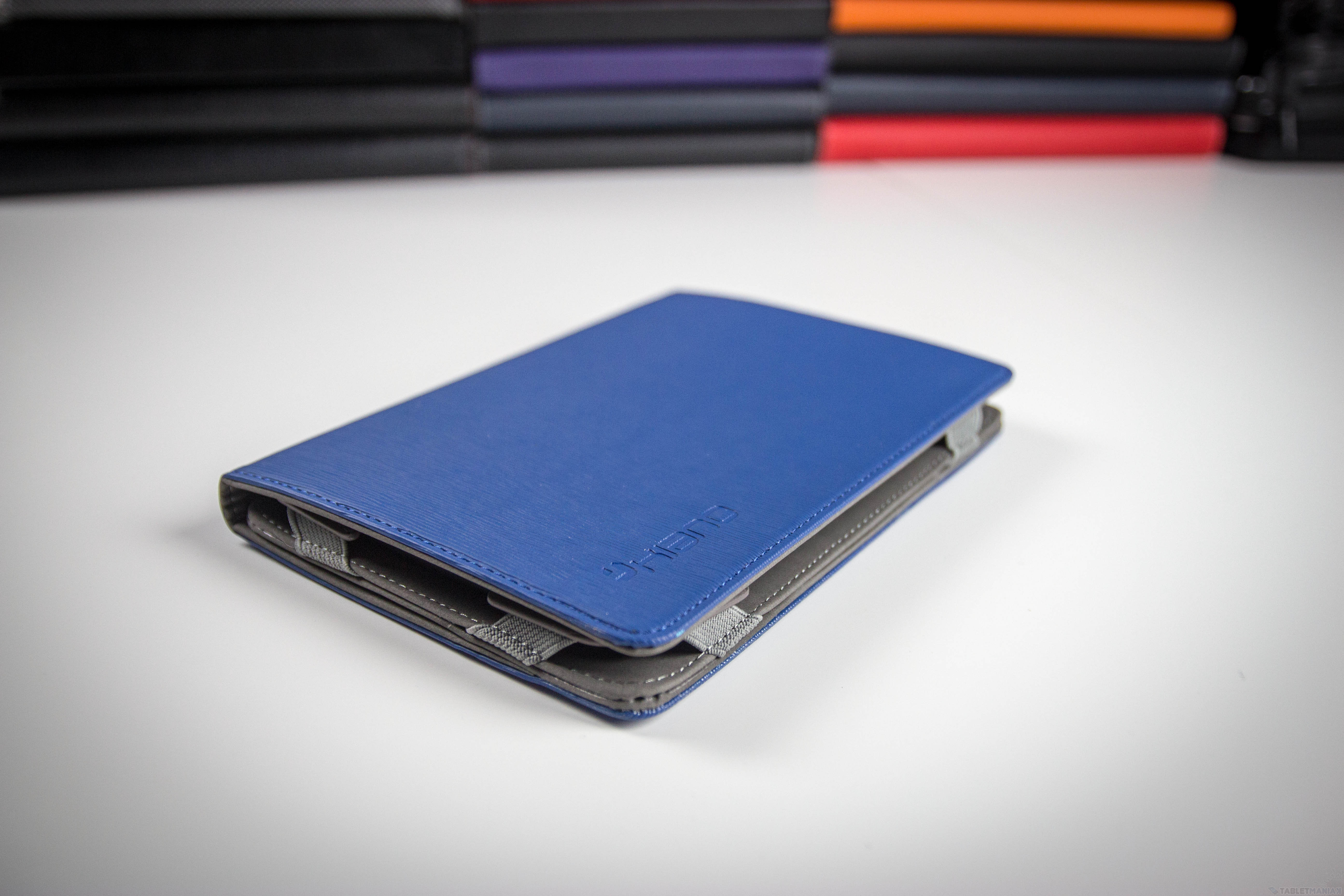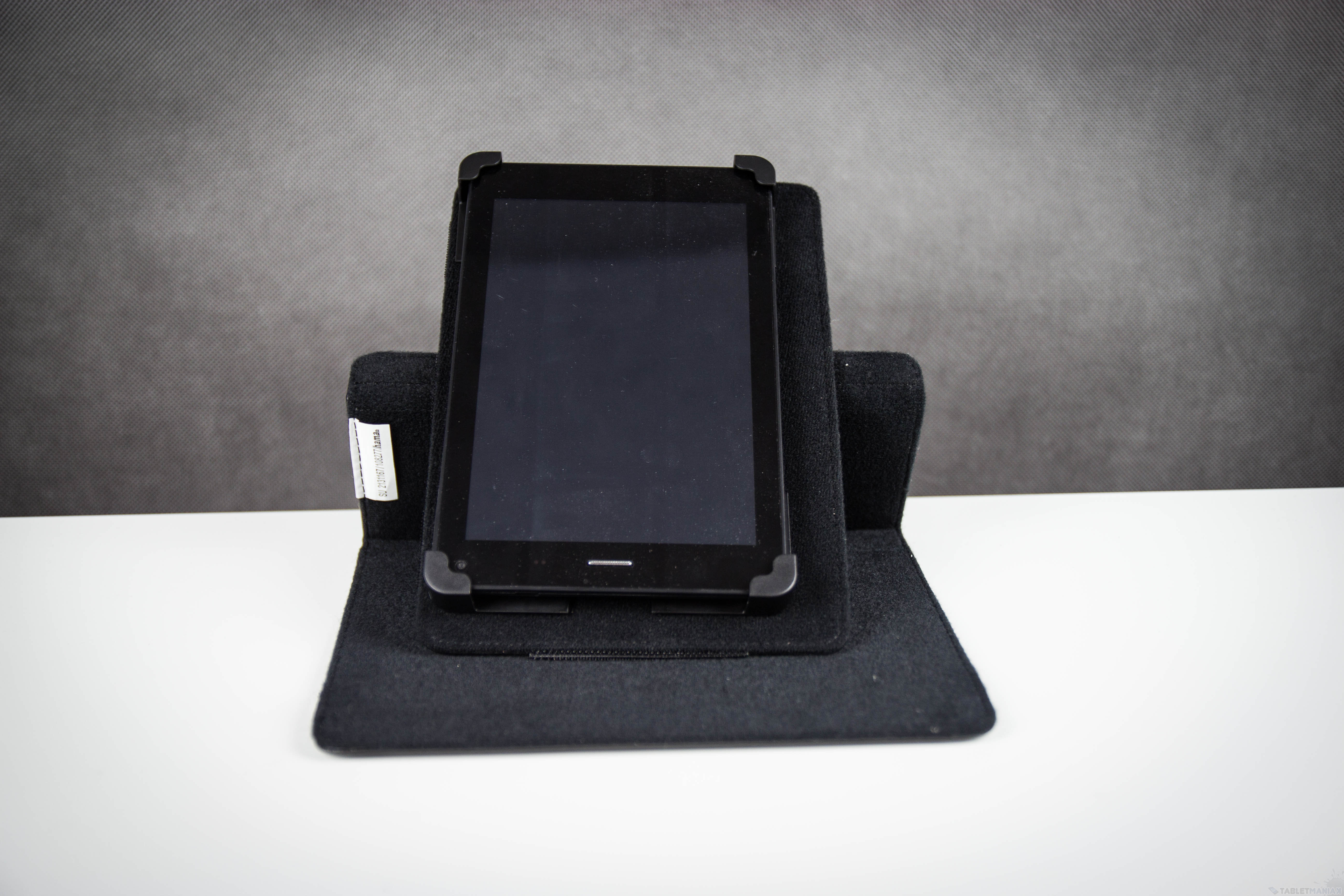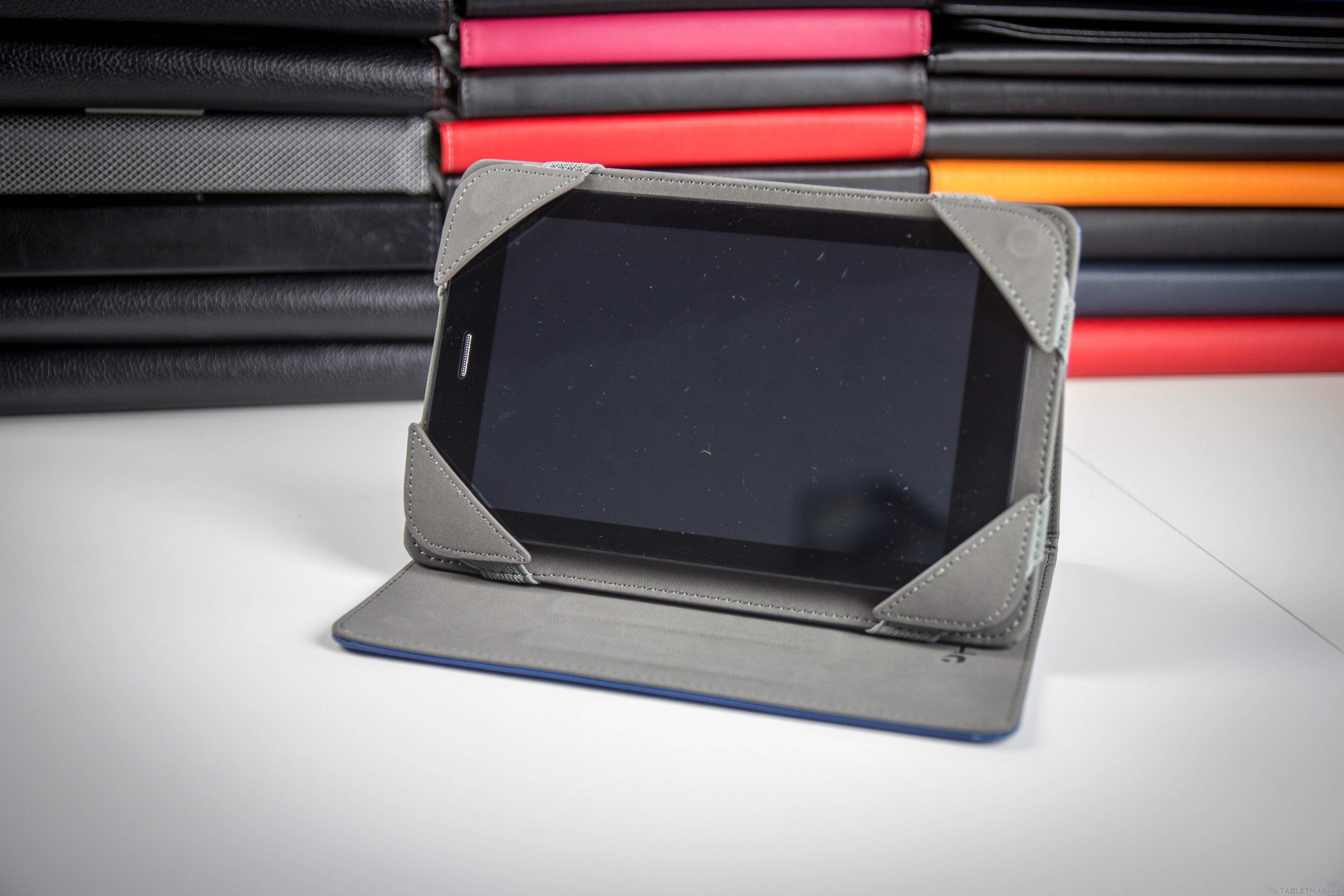 Wewnątrz widać szary materiał stylizowany na zamsz, a za chwyt odpowiadają cztery potężne narożniki na rozciągliwych gumkach – pomieściły i tablet 7″ i 7.65″. Stojak rozwiązano tutaj w dość typowy sposób – część etui odgina się do tyłu, a dół opiera się o wgłębienia w trzech pozycjach by zapobiegać poślizgowi. O ile jest to prosty sposób na stojak, tak używając go w podróży – na przykład na stoliku w samolocie, podczas turbulencji może się ta konstrukcja rozjechać.