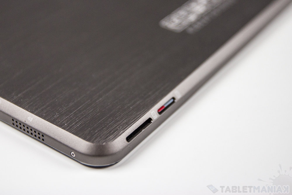 Na prawym boku zauważymy przycisk RESET, gniazdo ładowania, gniazdo Micro HDMI, Micro USB, mini-jacka i pojedynczy głośnik, są tu też dwa przyciski fizyczne. Od wersji z wyświetlaczem o wysokiej rozdzielczości ten model różni się jedynie slotem na karty SIM, umiejscowionym na dolnej krawędzi, zaraz obok slotu na karty microSD. Przy wymiarach 240 x 176 x 10 milimetrów mamy do czynienia z tą samą wielkością, ale minimalnie większą wagą – równo o 15 gramów (605 g).
