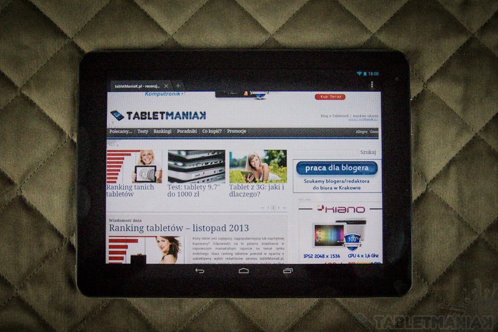 Kiano wykorzystało 9,7-calowy panel IPS o rozdzielczości 1024 x 768 pikseli. Dostajemy tu więc gęstość równą 132 PPI – nie jest to szczególnie wysoka wartość i trudno uznać ją za zaletę. Małe czcionki na stronach internetowych stają się już przy takim poziomie ostrości nieczytelne.