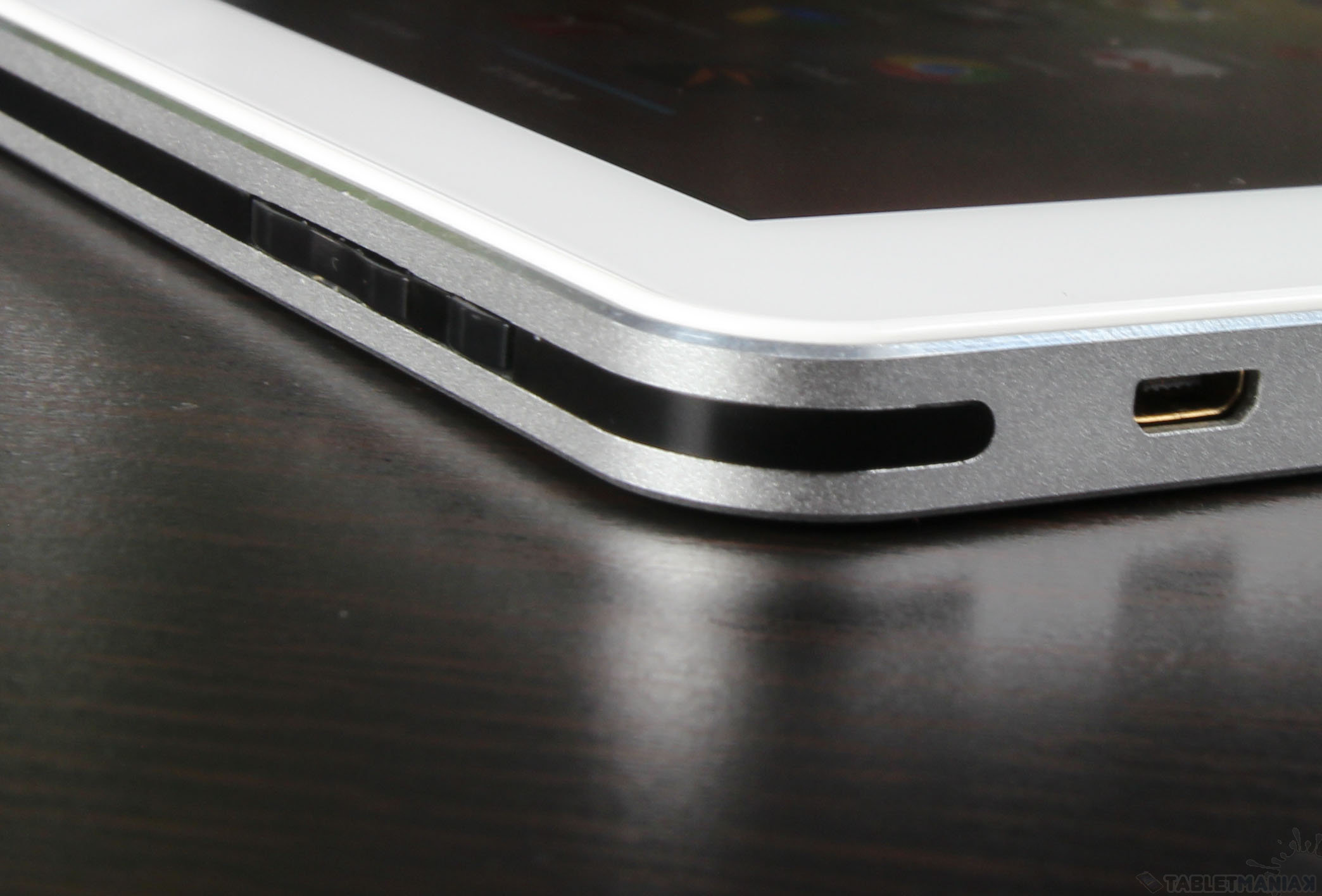 Ilość przycisków fizycznych ograniczono do trzech, czyli absolutnego minimum. Wszystkie skupione są w jednym miejscu – górnej części prawej krawędzi urządzenia (trzymając je w pionie) – i bardzo skutecznie zakamuflowane w czarnej, ozdobnej listwie. Na środku tej samej krawędzi znajdziemy równie dobrze ukryty otwór na kartę micro SD. Zaraz obok nich znajduje się wejście micro USB a po nim słuchawkowe. Trzymając tablet poziomo, po lewej i prawej stronie zobaczymy głośniki (stereo).