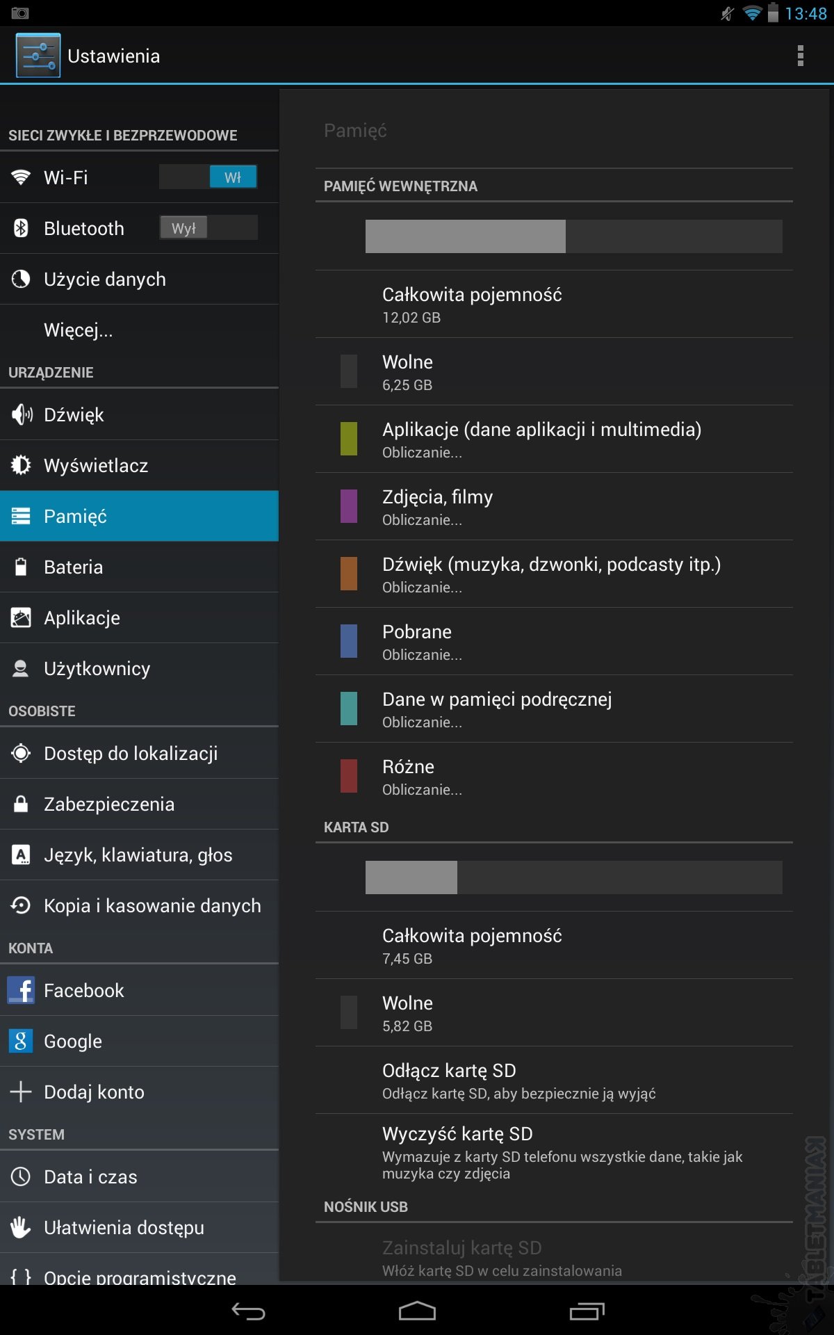Mimo iż tablet posiada teoretycznie 16 GB pamięci wbudowanej, to w praktyce użytkownik otrzymuje dokładnie 12,02 GB. Nie jest to mała wartość, ale jeśli ktoś potrzebuje więcej miejsca, pamięć można rozszerzyć o dalsze 32 GB, dzięki wejściu na karty micro SD. Zainstalowanych aplikacji nie można przenosić na zewnętrzne nośniki.