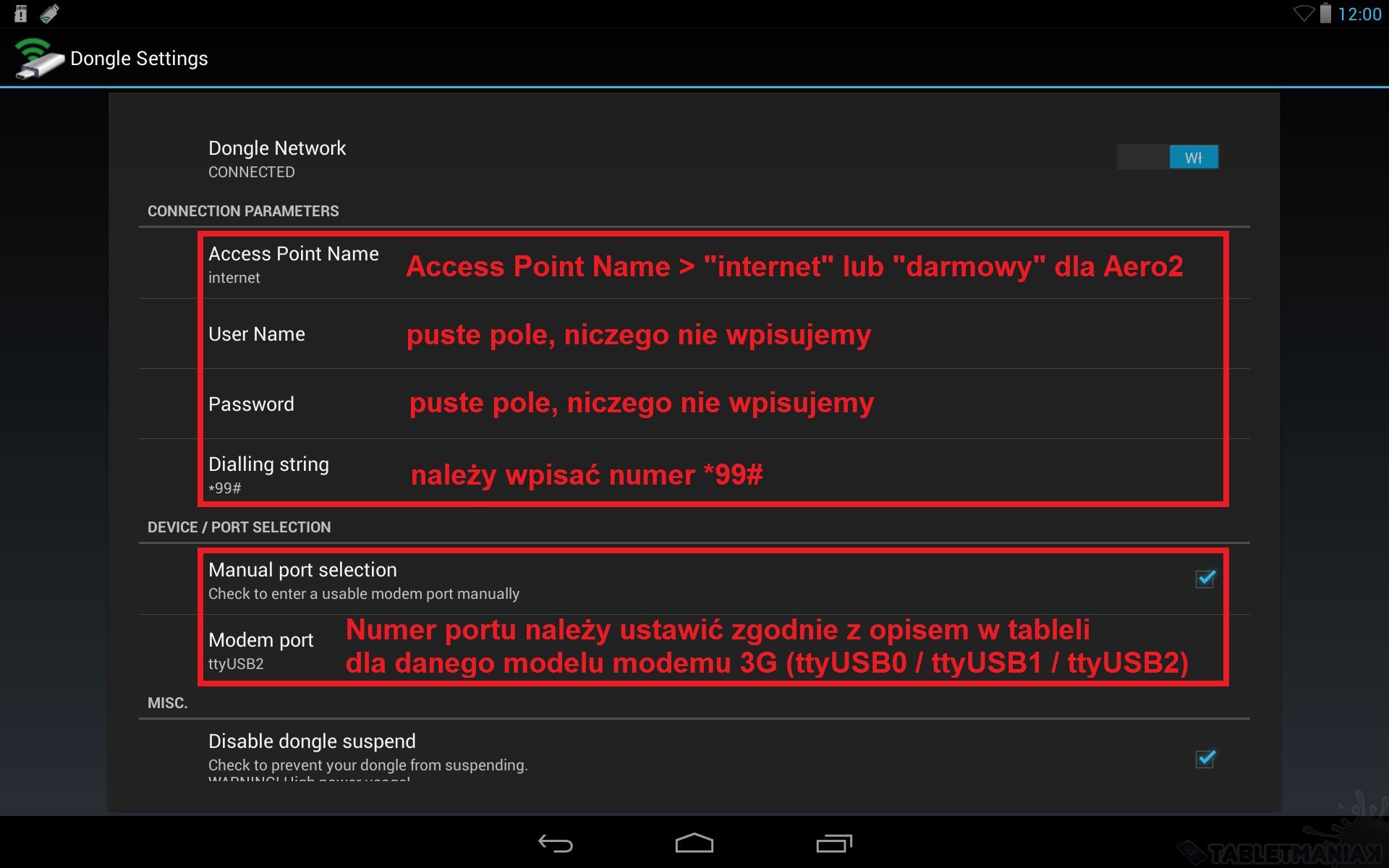 Jeżeli dysponujecie kompatybilnym modemem, podłączycie go przez port micro USB – system automatycznie wykryje nowe urządzenie, po czym wyświetli panel konfiguracyjny – a ten na pierwszy rzut oka może się wydawać skomplikowany, zwłaszcza dla kogoś, kto nie jest zaawansowanym tabletManiaKiem. Ustawiając parametry połączenia podać trzeba nie tylko APN (Aero 2 także jest obsługiwane), ale również ręcznie wpisać port modemu i uzupełnić pole „Dialling string”. Jak? Tego dowiecie się z poniższej ściągawki.