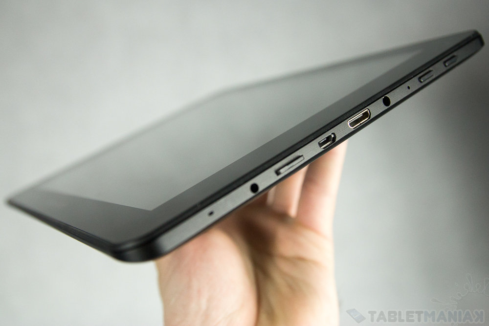 Wszystkie złącza i przyciski umiejscowiono na prawej ściance; z drugiego boku, u góry i dołu nie znajdziemy żadnych elementów wyposażenia. Wspomniana listwa kryje guzik zasilania/blokady ekranu, fizyczny przycisk powrotu, przycisk resetujący, gniazdo słuchawkowe, wyjście Mini HDMI, gniazdo USB, slot na karty microSD, gniazdo ładowania i mikrofon. Irytujące okazało się wystawanie karty pamięci, która w jednej piątej swojej długości znajduje się poza tabletem. Można przez to nie tylko przypadkowo ją wysunąć, ale też, co gorsza, nawet złamać.
