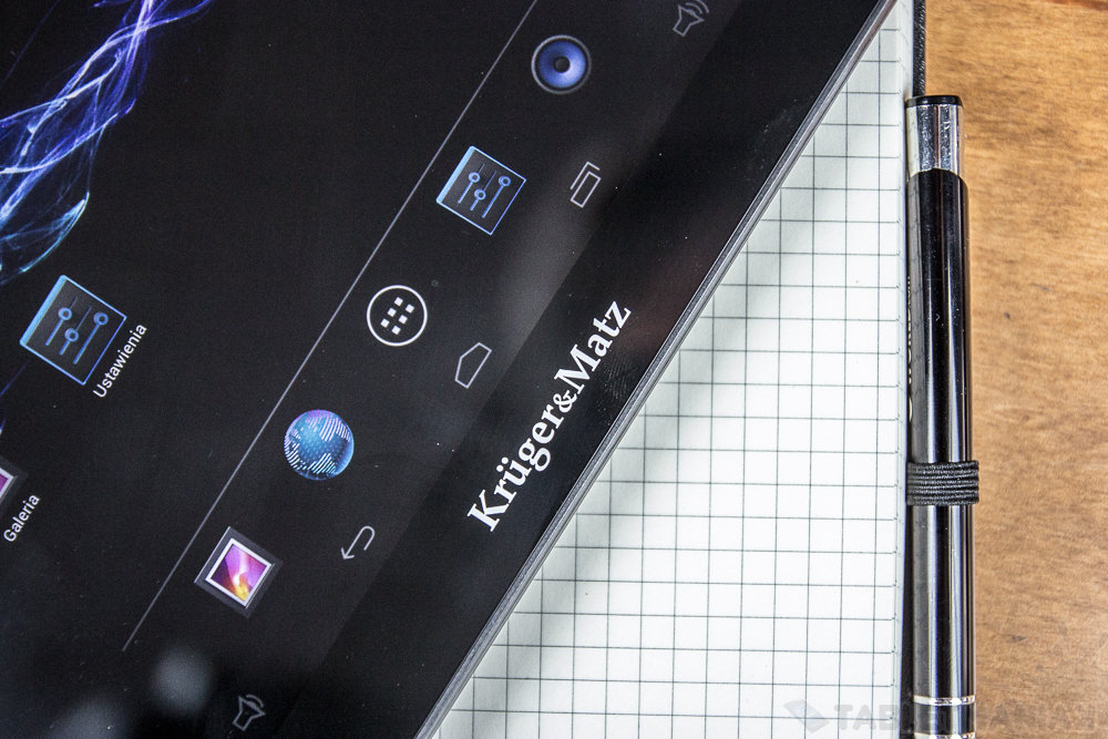 Kruger&Matz zdecydował się na wykorzystanie 9,7-calowego ekranu o rozdzielczości 2048 x 1536 pikseli, co owocuje gęstością na poziomie 264 PPI. Obraz jest ostry, odpowiednio nasycony i neutralny od strony temperatury barwowej. To, tym samym, jeden z kilku tabletów poniżej 1000 złotych wykorzystujących tego rodzaju rozdzielczość.