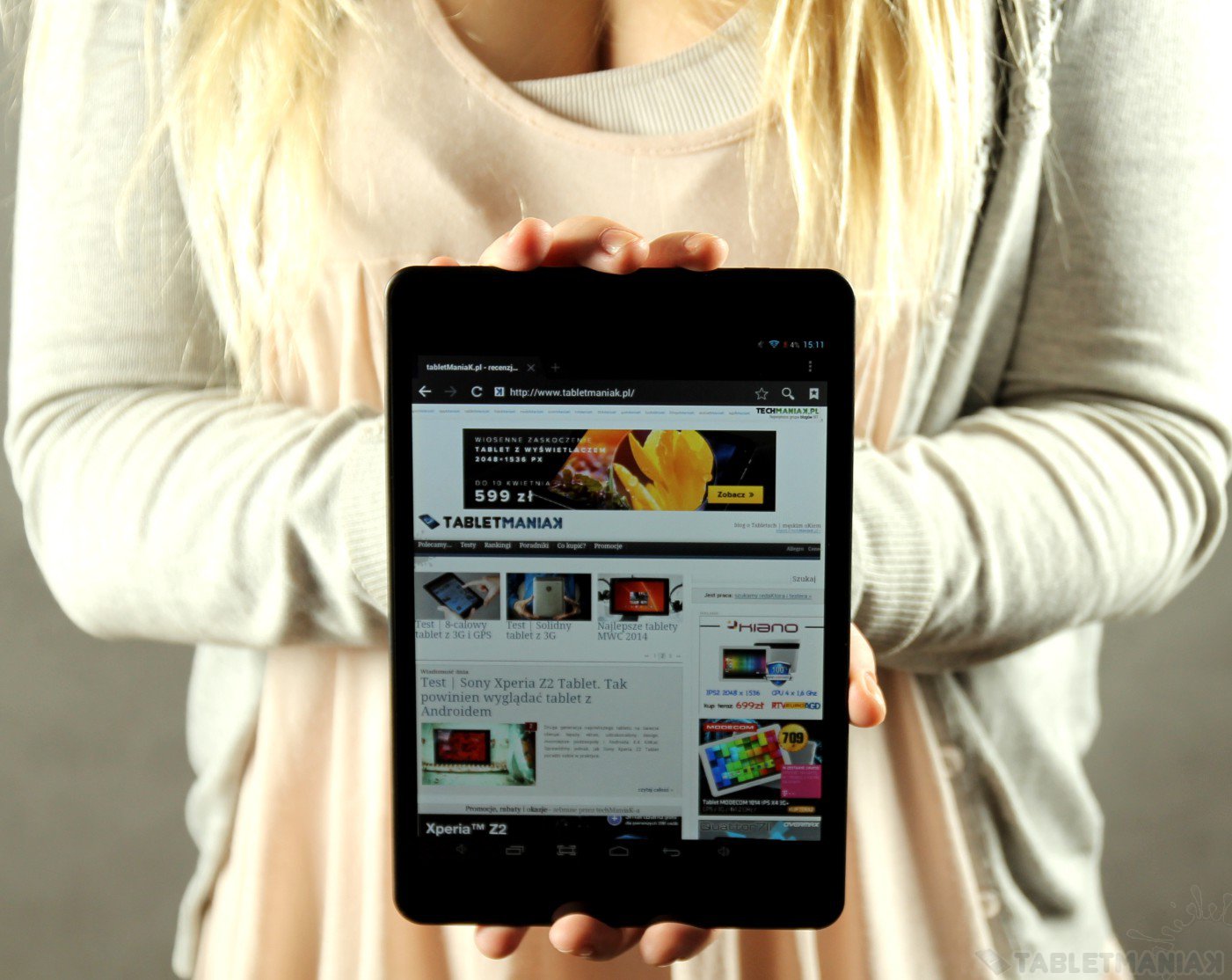 Wyświetlacz testowanego tabletu wykonany został w technologii IPS i obdarzony przekątną (unikalną – jak pisze producent na swojej stronie) 7.85”. Rozdzielczość 1024 x 768 przekłada się na zagęszczenie pikseli równe 162 ppi, co jest może średnim wynikiem, ale muszę przyznać, że mimo to wystarczającym – ekran prezentuje się dobrze i przyjemnie się na niego patrzy, co może być też zasługą mocno nasyconych kolorów. Panel dotykowy obsługuje maksymalnie pięć punktów i cechuje się naprawdę wysoką czułością. Kąty widzenia są dobre, jak przystało na IPS.