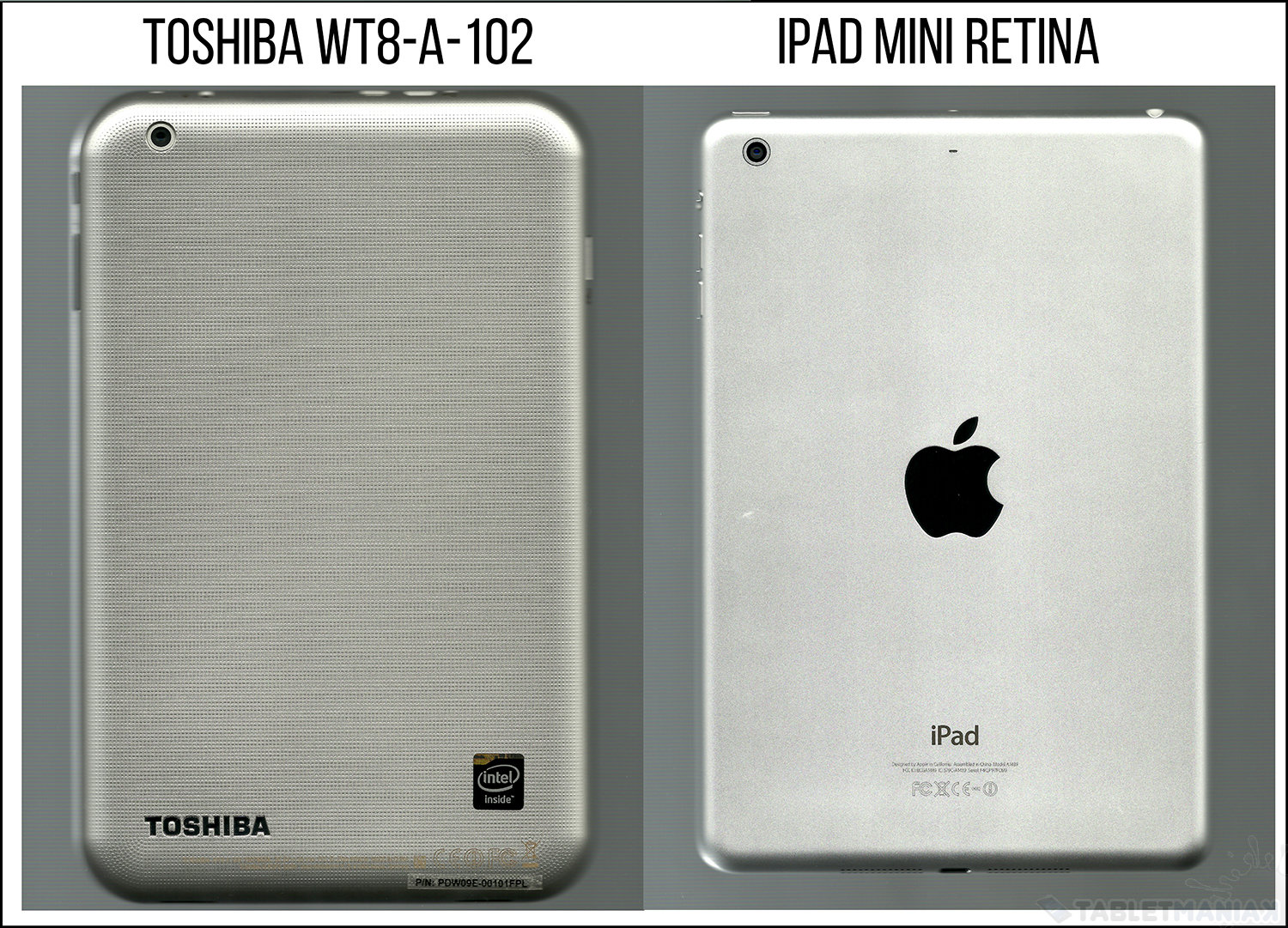 O ile mniej znane marki trzymają się obecnie albo formatu iPada Mini, albo kultywują nieco już archaiczny wzór dużego i masywnego tabletu 8-calowego, tak duzi gracze pozwalają sobie na większą swobodę, czego efektem są choćby LG G Pad 8.3 i niedawno zaprezentowany Samsung Galaxy Tab Pro 8.4. Oba urządzenia cechuje nietypowa przekątna i specyficzny, wydłużony kształt, dzięki któremu łatwiej urządzenie schować w kieszeni spodni lub marynarki. Zbliżona koncepcja przyświecała również projektantom linii Note (Samsung), a także inżynierom stojącym za koncepcją 8-calowego tabletu z Windowsem, czego dobrym przykładem jest Toshiba Encore WT8-A-102 – tutaj warto jednak zwrócić uwagę na generalnie sporą różnicę w gabarytach: na poniższej grafice zestawiliśmy model japońskiego giganta z tabletem sygnowanym przez Apple.