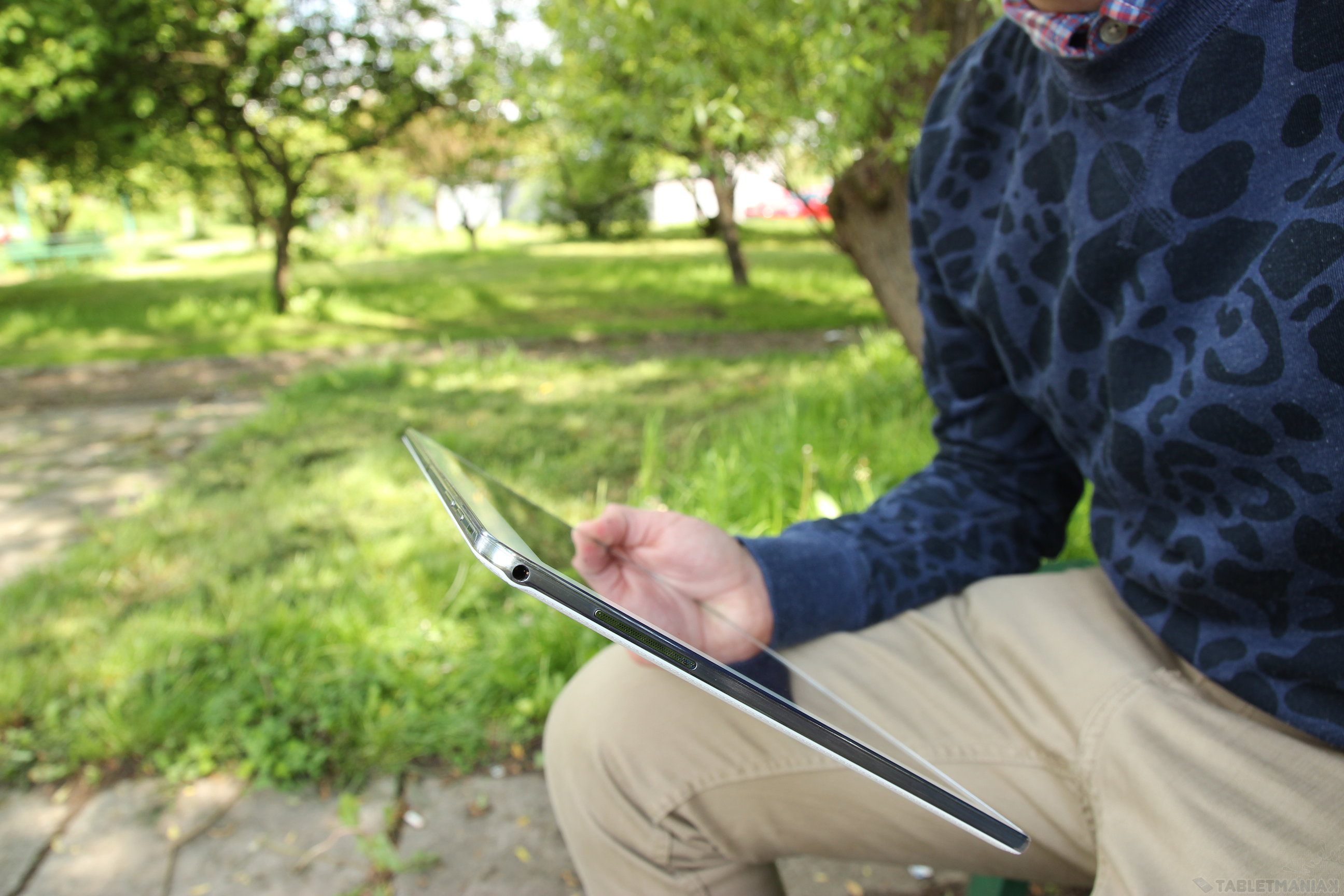 Skłamałbym, gdybym napisał, że tablet mi się nie podoba. To naprawdę udana konstrukcja pod względem estetyki i za to należy się ogromna pochwała dla koreańskiego producenta. Jednakowoż nie mogę przymknąć oka na liczne trzaski i trzeszczenia towarzyszące korzystaniu z urządzenia. To nie jedyny mankament, do którego trzeba się będzie przyzwyczaić. Kiedy użyjemy więcej siły zauważymy także, że tablet potrafi się wygiąć. Niestety duże rozmiary pociągają za sobą pewne konsekwencje. Powłoka wyświetlacza ugina się, a kiedy użyjemy więcej siły, powstaną odbarwienia na ekranie. Czy w sprzęcie za takie pieniądze jest to w ogóle dopuszczalne? Wątpię. Dodam jednak, że elementy konstrukcji zostały dobrze ze sobą spasowane. Nie odnotowałem obecności jakichkolwiek szpar czy ostrych krawędzi.