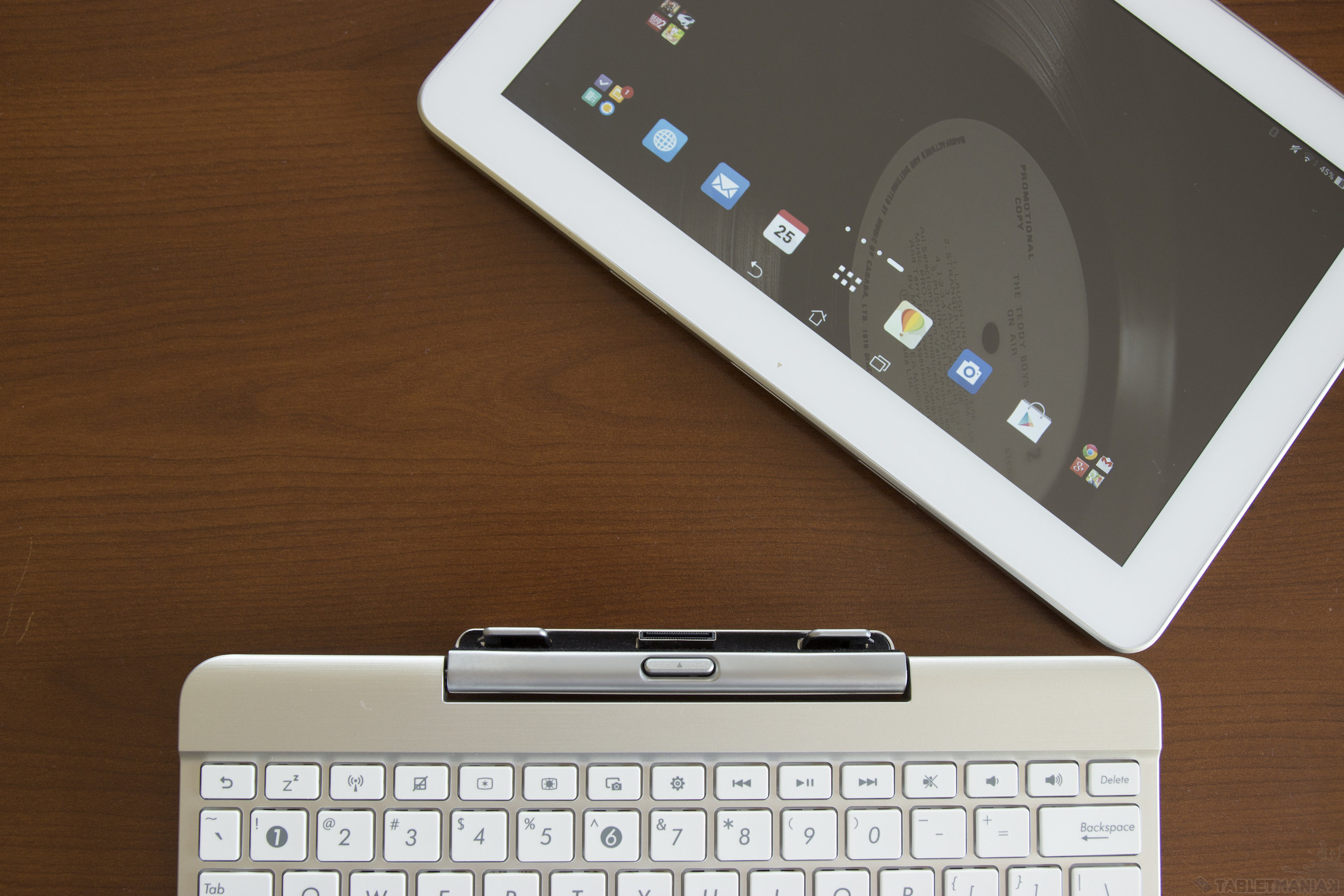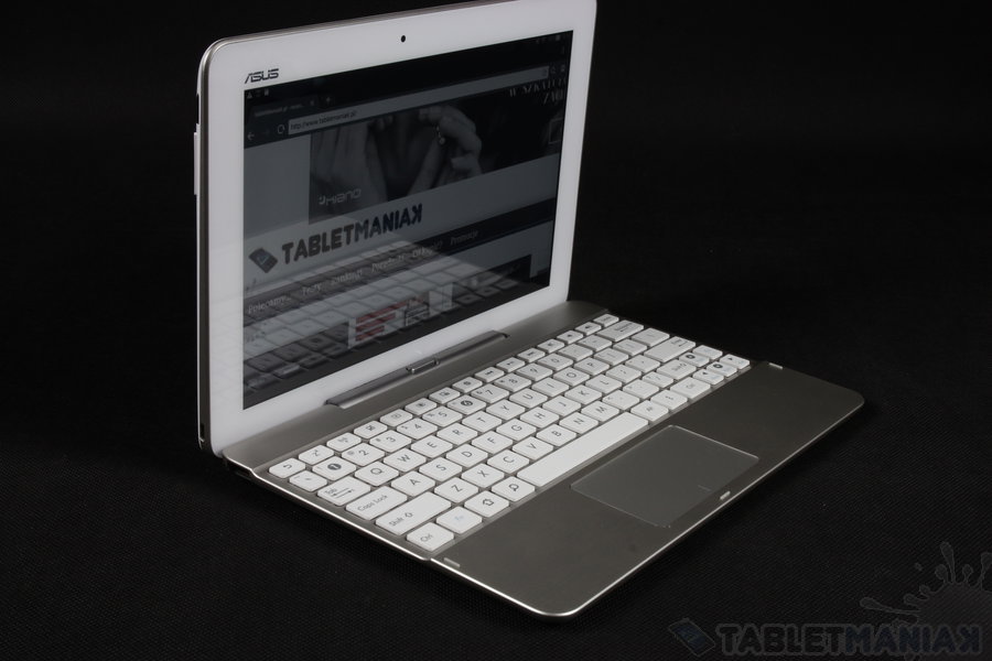 Mocowanie tabletu w klawiaturze odbywa się przy pomocy specjalnej dyszy, na której ulokowano dwa bolce po skrajnych stronach i złącze po środku. Aby odłączyć jedno od drugiego, trzeba wcisnąć specjalny guzik. Niezależnie od wprowadzonych rozwiązań, tablet i tak się delikatnie chwieje. Nie radzę przenosić urządzenia chwytając wyłącznie za górną część. Warto też nadmienić, że konstrukcja została tak zaprojektowana, że przy normalnej pracy klawiatura jest ustawiona delikatnie pod kątem. Pomaga to we wpisywaniu tekstu. Niestety ekran daje się tylko nieznacznie odchylić do tyłu. Szerszy zakres kątów byłyby mile widziany.