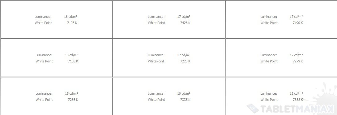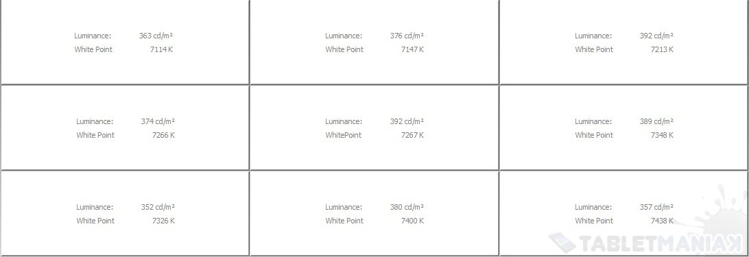Miło dla odmiany testować tablet, którego maksymalne podświetlenie jest takie, jak należy. Pomiary pokazały, że testowany model posiada maksymalną wartość luminacji dochodzącą do 392 cd/m2. Co to oznacza? Będziemy mieć jeszcze sporadyczne problemy z widocznością w słoneczne dni (z naszych obserwacji wynika, że przy <350 cd/m2 ekran zaczyna przegrywać ze słońcem), ale w większości wypadków nie powinniście mieć problemów z używaniem urządzenia w plenerze. Zarejestrowana wartość minimalna to 17 cd/m2. Jeszcze nie ideał, ale na komfortową obsługę nocą można z pewnością liczyć.