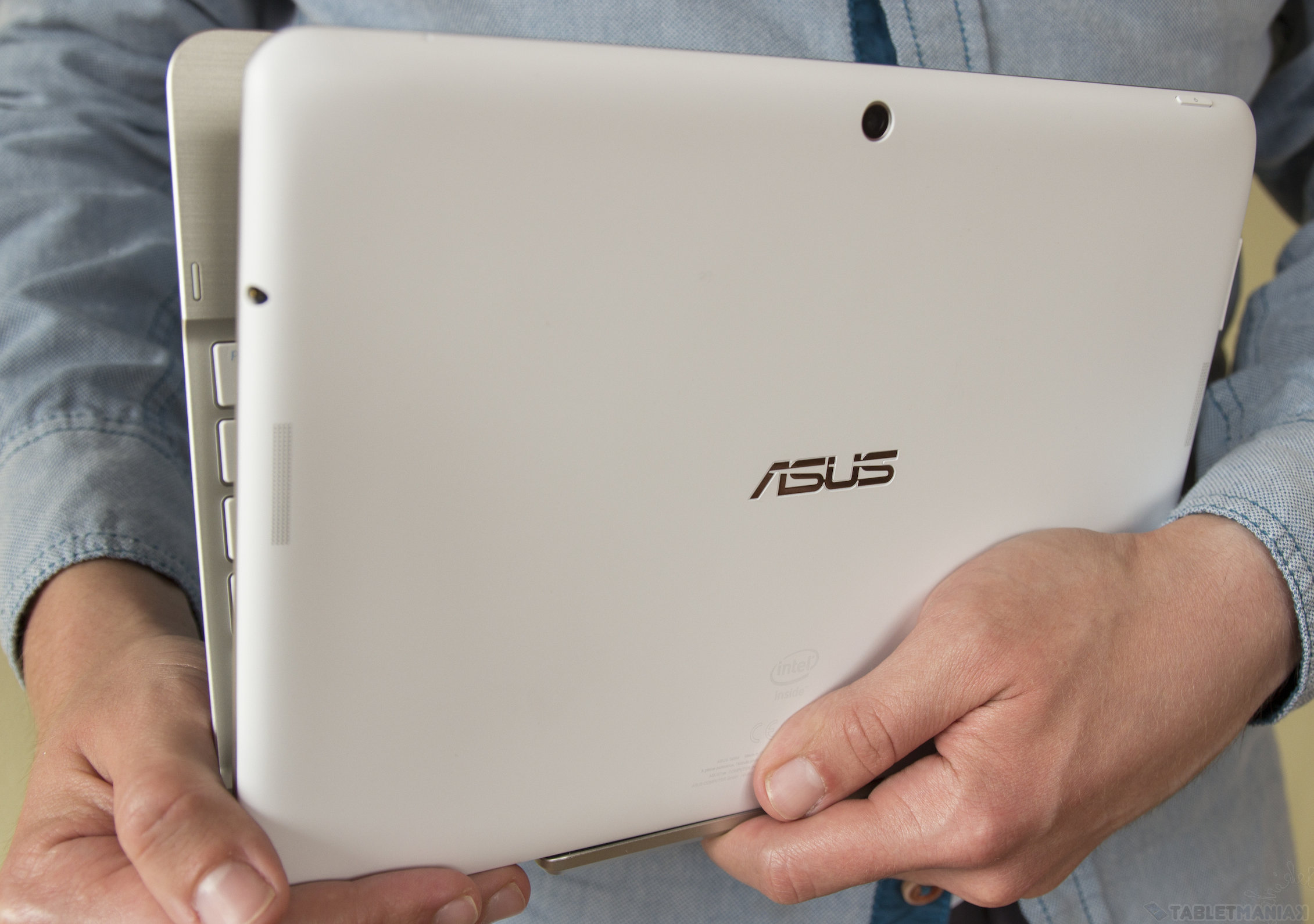Oprócz wspomnianej już kamerki do wideorozmów, obudowę wzbogacają także przyciski fizyczne (włączania/wyłączania i regulacji głośności) oraz port microUSB (dodatkowe „pełne” złącze USB jest w klawiaturze) i gniazdo na kartę microSD. Producent porozrzucał je po wszystkich krawędziach, dlatego trzeba się początkowo troszkę naszukać. Dolną krawędź – trzeba to napisać – szpecą otwory, w które wpina się klawiaturę. Coś kosztem czegoś, czyli jak design przegrywa z funkcjonalnością. Przestrzeń plecków tabletu została zagospodarowana z większym pomysłem, dlatego u góry jest kamera, po bokach głośniki stereo a środkową część zdobi wypukłe logo producenta. Nie mogło też zabraknąć ikonicznego już znaczka „Intel Inside”.