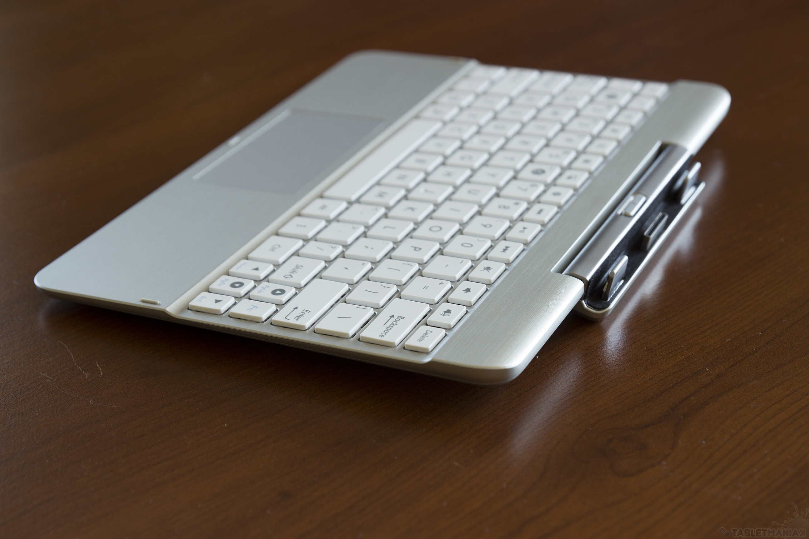 Dodana do kompletu klawiatura nawiązuje stylistycznie do tabletu. Wykonana z tworzywa sztucznego, ma ten sam kolor co obwódka, a kiedy konstrukcję się złoży, wszystkie elementy tworzą spójną całość. Cytując moją dobrą koleżankę, „ma to sens”. Elementem kontrastującym są białe klawisze, pod którymi zmieszczono jeszcze niewielki gładzik. Na spodzie ulokowano cztery gumowe nóżki skutecznie uniemożliwiające poruszenie się urządzenia w trakcie wpisywania tekstu. Są też niezakryte główki śrubek – troszkę to przypomina styl MacBooka. 🙂
