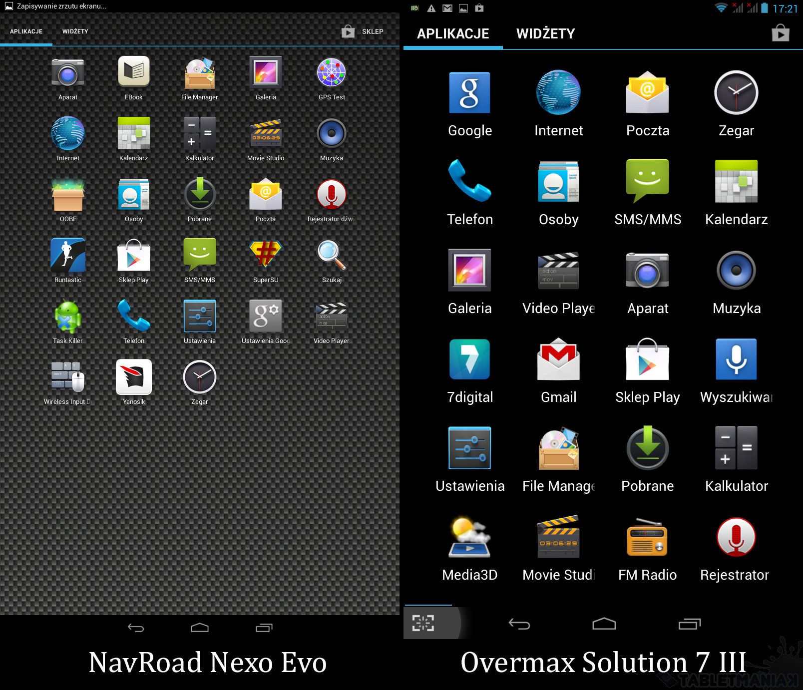 Różnice w skalowaniu elementów systemowych są wyraźnie zauważalne w bezpośrednim porównaniu dwóch modeli — NavRoada Nexo Evo i Overmaxa Solution 7 III. Ekrany obu pracują w takiej samej rozdzielczości (1280 na 800 pikseli), przy czym widać wyraźną różnicę w wielkości wyświetlanych ikon (warto zauważyć, że w obu przypadkach wyświetlane jest 6 rzędów ikon). W przypadku modelu Solution 7 III, menu systemowe wydaje się gigantyczne, kiedy porównamy je z drugim tabletem. Menu systemowe o podobnej wielkości posiada także Acer Iconia B1-730HD. Takie proporcje mają też zaletę — ułatwiają korzystanie z tabletu, zwłaszcza, jeśli ktoś ma słabszy wzrok.