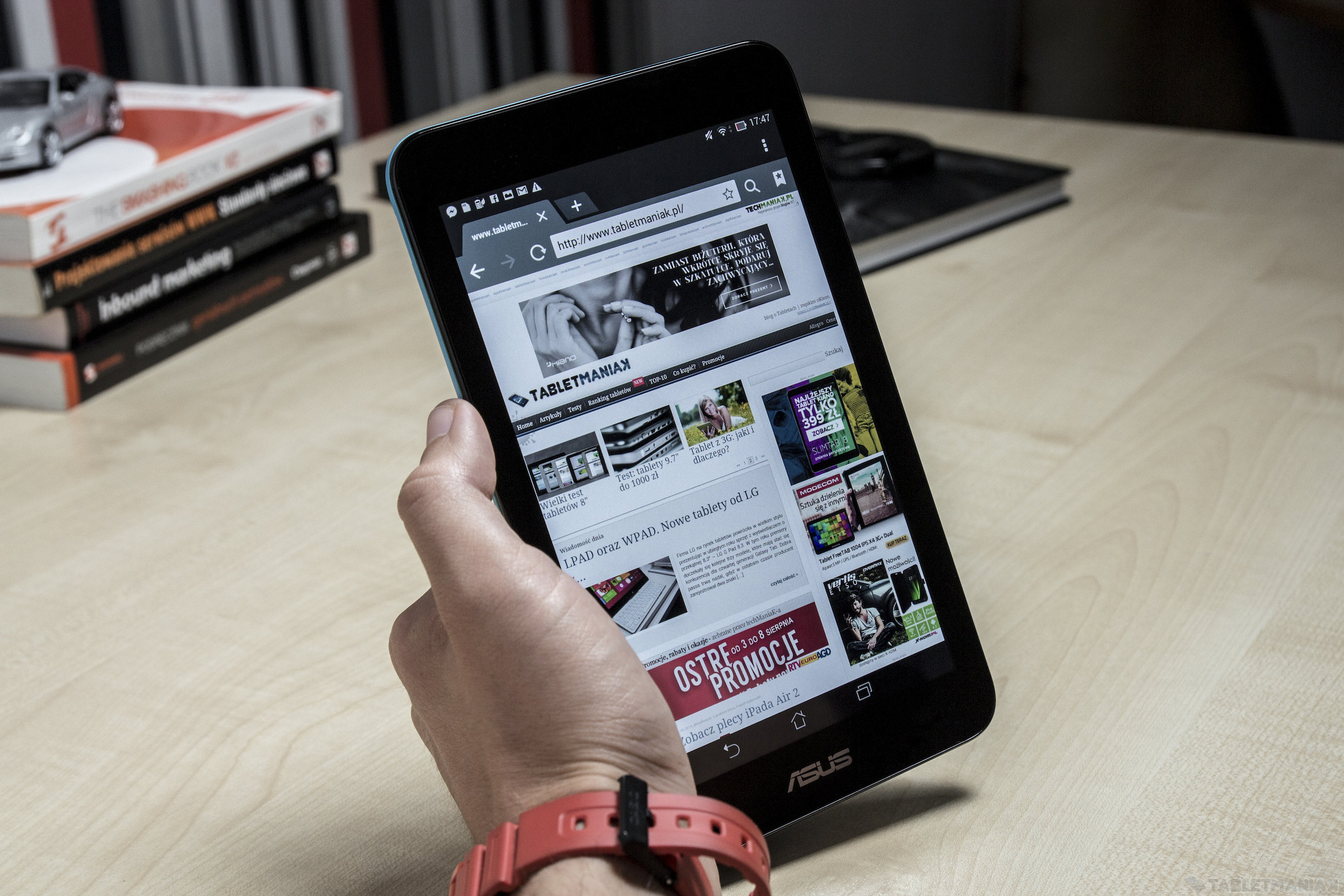 Producent wyposażył sprzęt w 7-calowy ekran pracujący w rozdzielczości 1280 na 800 pikseli. Specyfikacja sugeruje nieduże zagęszczenie punktów, ale tak jak w przypadku testowanego przeze mnie Transformer Pad TF103C, tak i tu czcionki wydają się być wygładzone. Nie twierdzę, że obraz jest wyjątkowo ostry, ale nie daje tak złych wrażeń wizualnych, jak tańsze tablety posiadające ekrany o zbliżonych parametrach. Istnieje możliwość przeglądania stron internetowych w widoku komputerowym nawet w ułożeniu pionowym, z zachowaniem dobrej czytelności treści – sugerowałbym jednak pracę w ułożeniu poziomym.