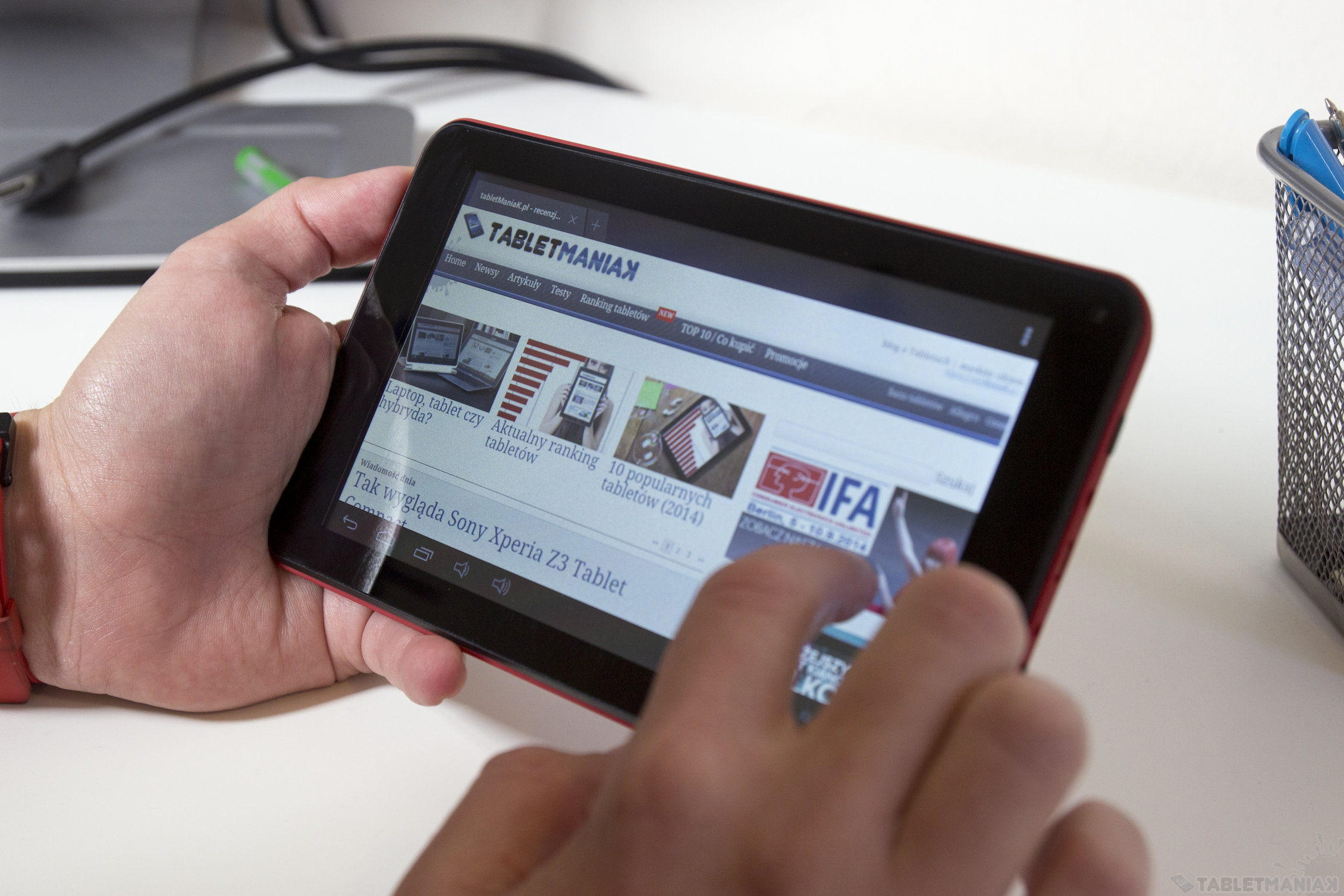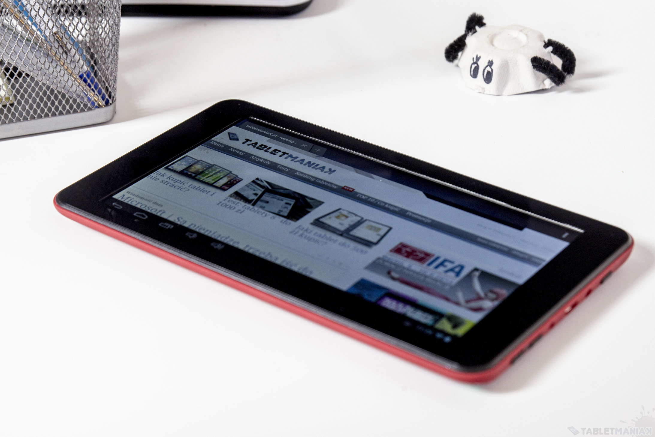 Ekran pokryto szkłem, ale producent przezornie podszedł do sprawy i fabrycznie została naklejona folia zabezpieczająca. Choć pokrywa dobrze broni się przed silniejszym naciskiem, to nie udało się całkowicie wyeliminować pojawiających się na wyświetlaczu plam. Plecki tylko delikatnie się uginają, ale konstrukcja nie skrzypi. Jakość wykonania jest naprawdę dobra i zadbano nawet o solidne usadowienie guzików, obok których znajdziemy jeszcze gniazdo microUSB, wejście na ładowarkę i slot na karty microSD. Tablet otrzymał głośnik monofoniczny, aparat główny i kamerę do wideo rozmów. Ciężko oczekiwać czegoś więcej za tę cenę.