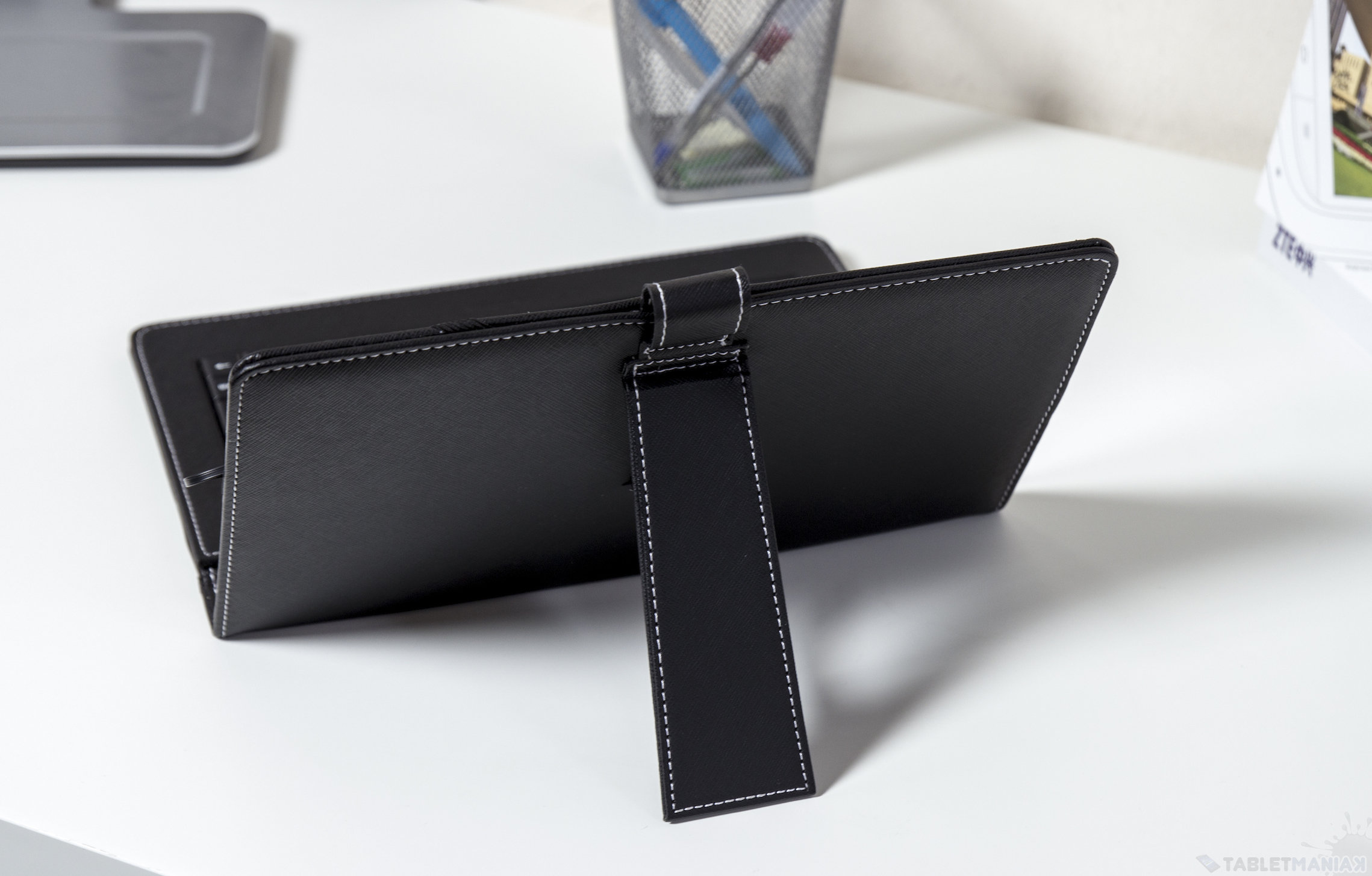 Jak już wcześniej wspomniałem, w pudełku znajdziemy jeszcze ochraniacz, który jest jednocześnie zewnętrzną klawiaturą. Montowanie tabletu w akcesorium odbywa się przy pomocy trzymadeł, które dopasowują się do rozmiarów tabletu. Teoretycznie więc możemy zamontować jakiś inny, większy model, ale mniejszego z kolei już nie. Etui wykonano z tworzywa imitującego skórę, przy czym już na pierwszy rzut oka widać, że ochraniacz jest bardziej funkcjonalny niż estetyczny.