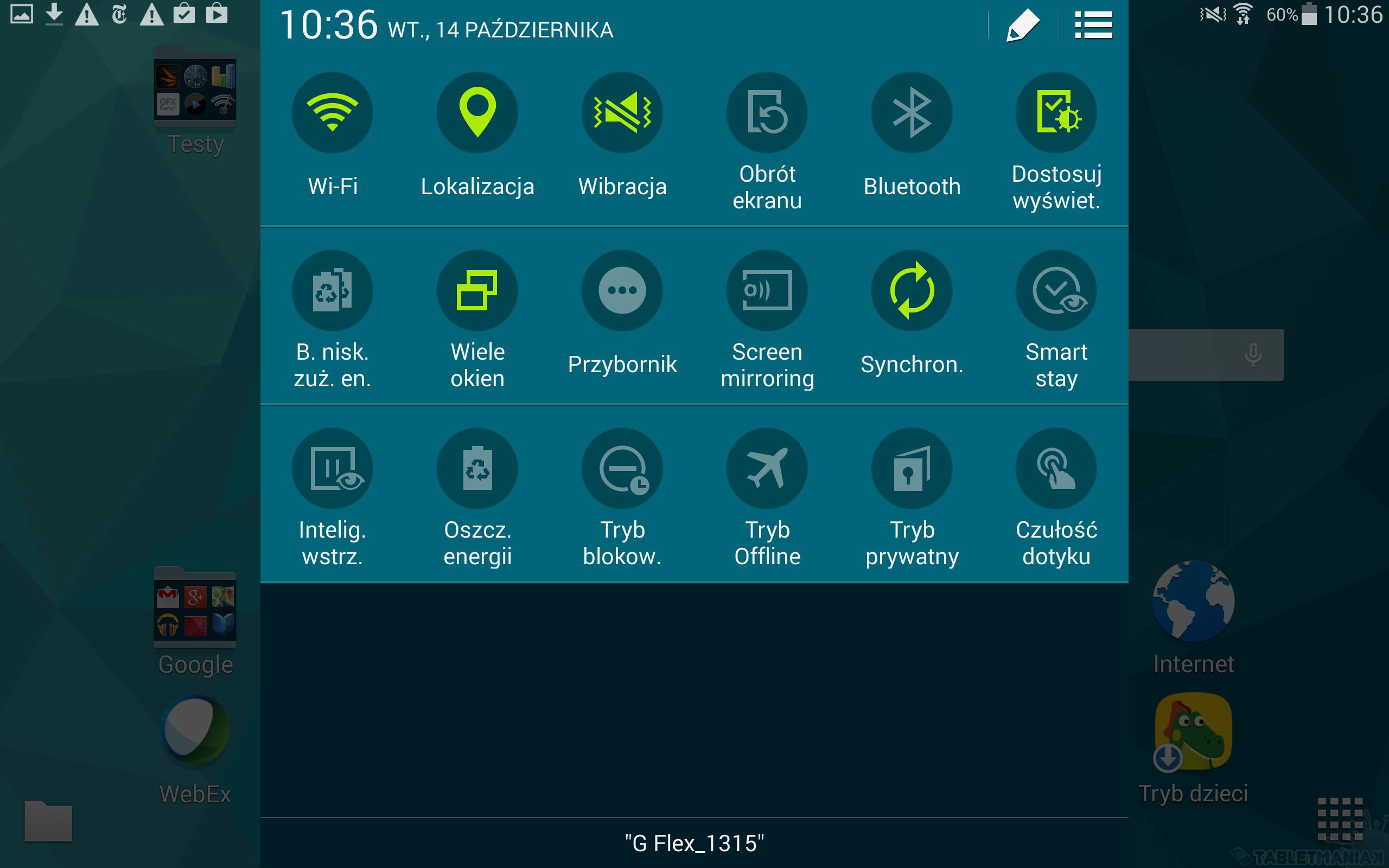 Jak na Samsunga przystało, doinstalowana nakładka systemowa wzbogaca nie tylko wygląd, lecz także funkcjonalność Androida, ale nie są to dodatki, których już wcześniej byśmy nie spotkali. Częściowo zostały one po prostu przeniesione z Galaxy S5. Jedną z ciekawszych nowinek jest funkcja zmniejszenia zapotrzebowania energii tabletu. Po jej uaktywnieniu ekran wyświetla obraz w skali odcieni szarości, a ilość dostępnych opcji zostaje mocno zawężona. W codziennym użytku nie wydaje mi się, aby można było pracować w tym trybie, ale jeśli zajdzie taka potrzeba, z pewnością bardzo się przyda.