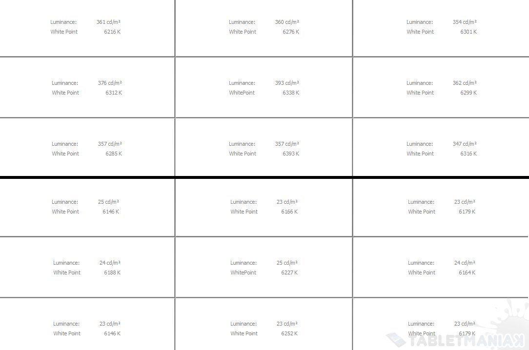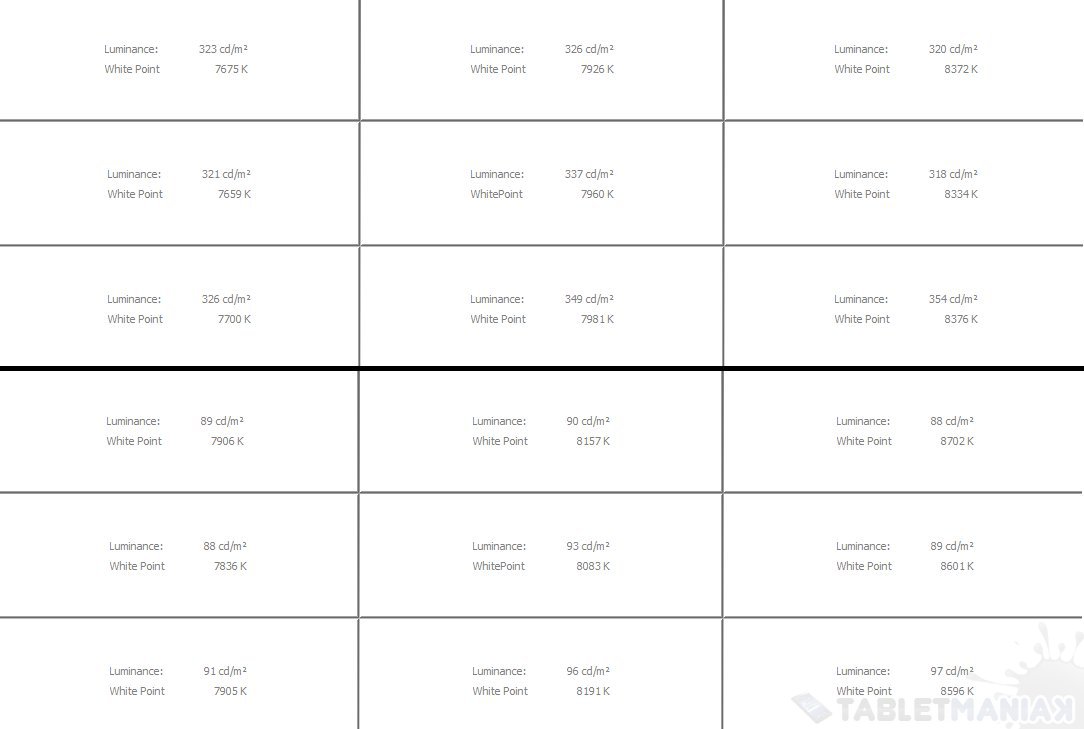 W 10-calowym modelu maksymalne podświetlenie wynosi 393 cd/m2, ale taki pomiar zarejestrowaliśmy wyłącznie w jednym miejscu matrycy. Przy minimalnym podświetleniu odnotowaliśmy wartość równą 23 cd/m2. W ósemce wartości te wynosiły kolejno 354 cd/m2 i 88 cd/m2. O ile o podświetleniu maksymalnym można powiedzieć, że jest prawidłowe, to (w modelu mniejszym) pomiar najniższego możliwego podświetlenia jest zdecydowanie za wysoki.