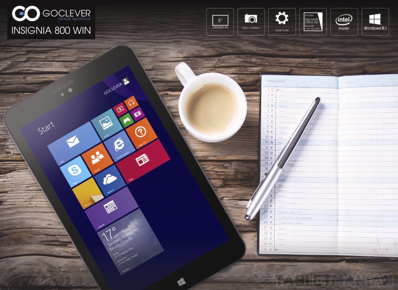 GOCLEVER Insignia 800 WIN wyposażony został w wyświetlacz IPS o przekątnej ośmiu cali, na którym obraz prezentowany jest w rozdzielczości 1280 x 800 pikseli. Moc obliczeniową dostarczyć ma Intel Atom Z3735E, który otrzymał wsparcie ze strony 1-gigabajtowej pamięci operacyjnej RAM, zaś na wszelkiego rodzaju dane zarezerwowano 16 GB wewnętrznej pamięci oraz slot na karty micro SD, nie zapominając o dysku w chmurze (OneDrive) o pojemności 1 TB.