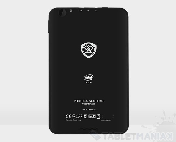 Prestigio MultiPad Visconte Quad prezentuje obraz w rozdzielczości 1280 x 800 pikseli na wyświetlaczu IPS o przekątnej ośmiu cali. Sercem tabletu jest Intel Atom Z3735G, który otrzymał wsparcie ze strony 1-gigabajtowej pamięci operacyjnej RAM, zaś na wszelkiego rodzaju dane zarezerwowano 16 GB wewnętrznej pamięci oraz czytnik kart w standardzie microSD (obsługa do 32 GB), nie zapominając o dysku w chmurze (OneDrive) o pojemności jednego terabajta.