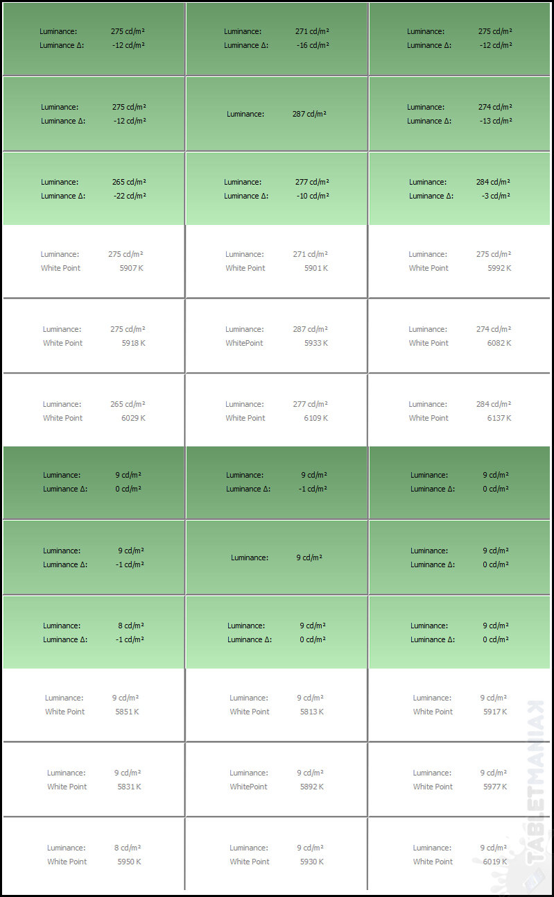 Skala regulacji jasności nie jest specjalnie szeroka. W dolnych progach mamy 8 cd/m2 (wystarczy, aby móc w miarę wygodnie czytać przy zgaszonym świetle), podczas gdy jasność maksymalna sięga 287 cd/m2 – nie jest to dużo, co odczujemy próbując używać tabletu w mocnym słońcu: obraz wyświetlany na ekranie nie będzie wtedy wystarczająco czytelny.