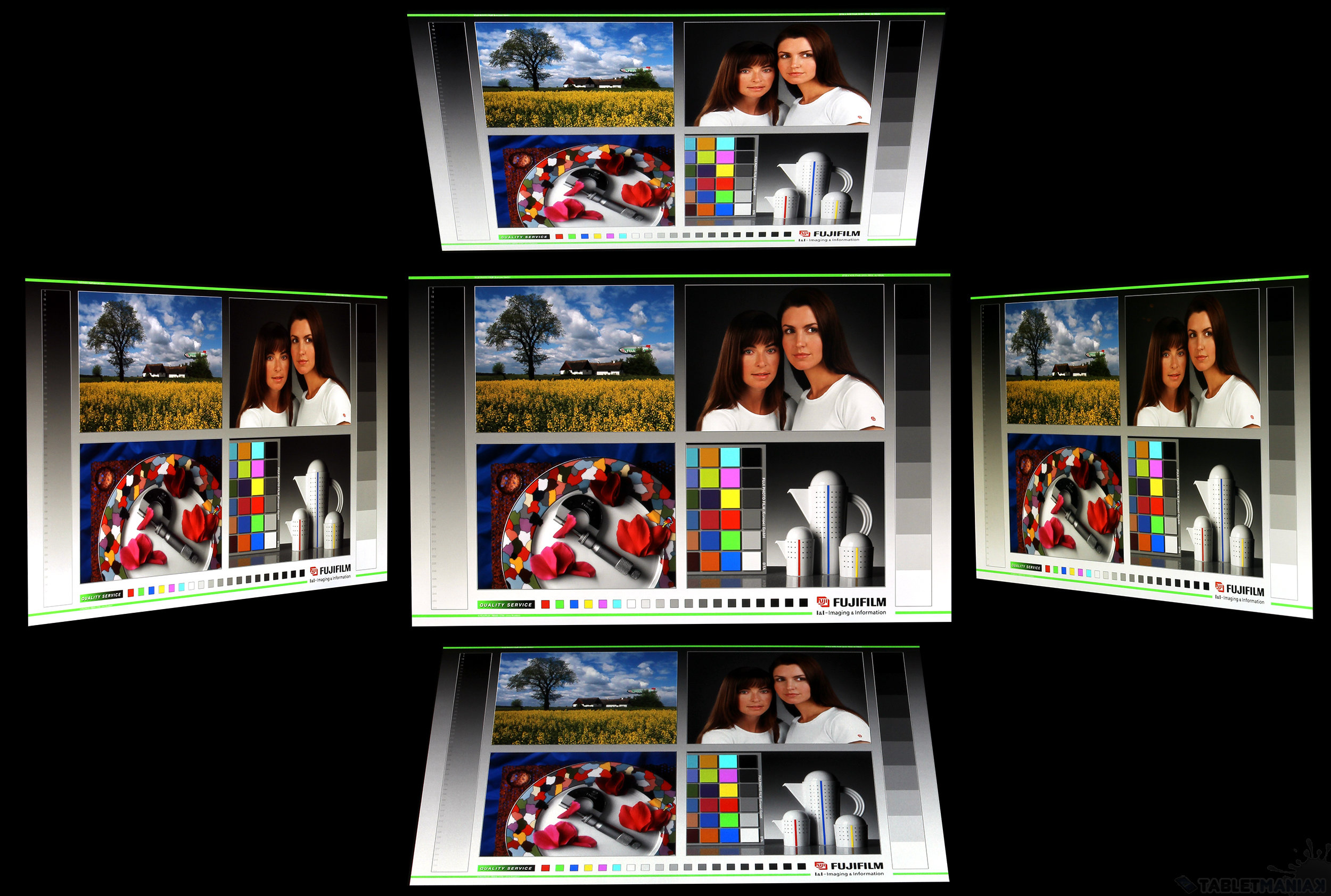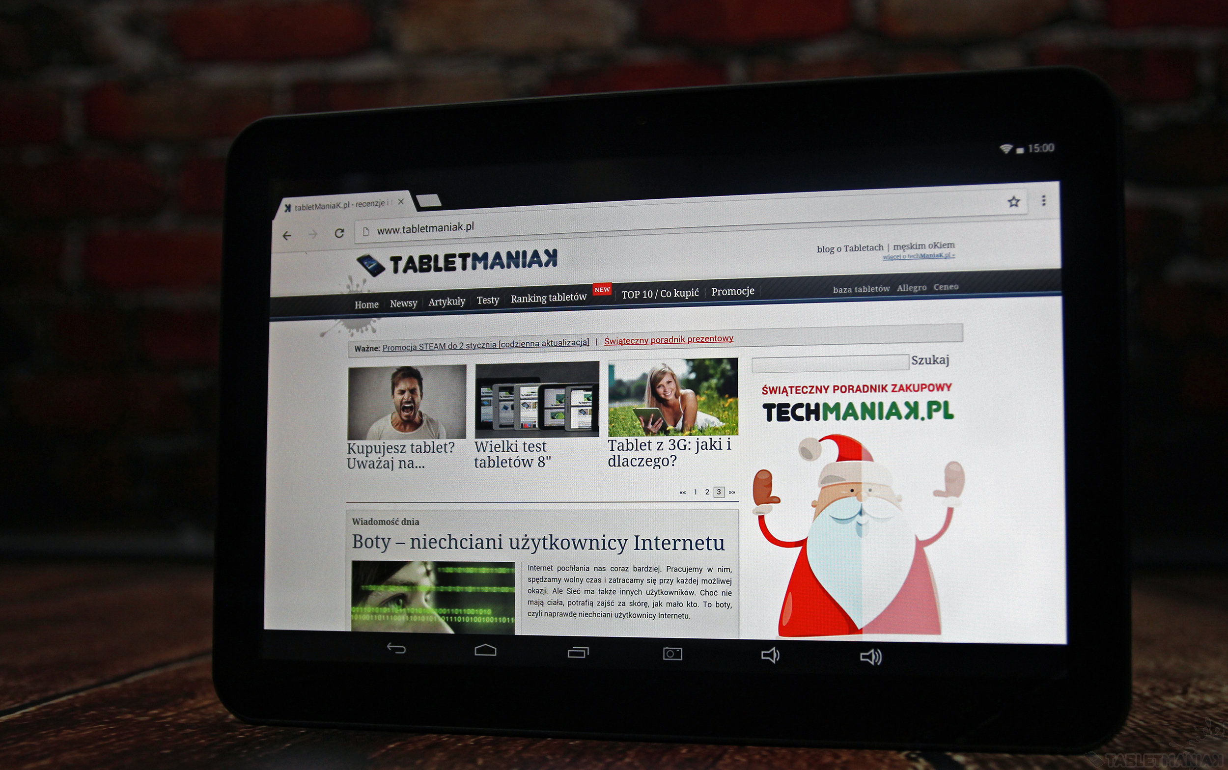 Ekran ma przekątną 10″ i rozdzielczość 1920 x 1200 pikseli – zagęszczenie jest więc równe 224 px/cal, co powinno zaspokoić potrzeby większości użytkowników. Nawet najdrobniejsze elementy na stronach internetowych są ostre i wyraźnie zarysowane. Panel wykonano w technologii IPS, a więc można oczekiwać ładnych kolorów i szerokich kątów widzenia. I tak też jest – choć nie jest idealny, wyświetlacz jest w stanie nieźle odwzorować barwy i zagwarantować brak deformacji obrazu niezależnie od kąta patrzenia.