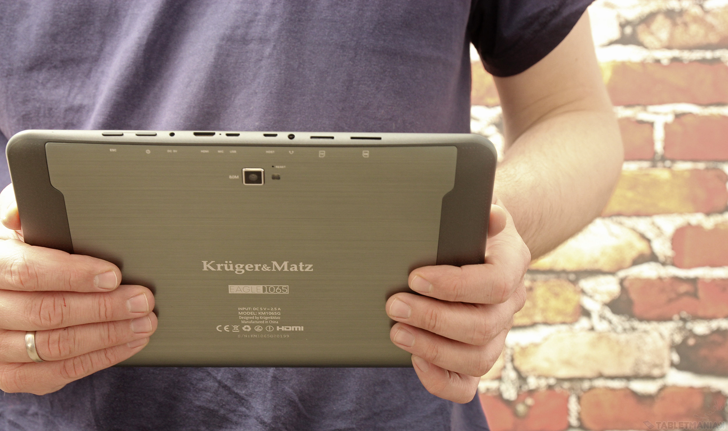 Kruger & Matz EAGLE 1065G został bogato wyposażony w zakresie portów komunikacyjnych. Mamy tutaj do czynienia aż z dwoma złączami microUSB (jedno posłuży do połączenia z komputerem, drugie do obsługi OTG), wejściem miniHDMI, słuchawkowym i na dedykowaną ładowarkę. Za pomocą gniazda USB host możemy podłączyć do tabletu niemal każde zewnętrzne akcesorium – od myszki po pamięć flash (FAT32 i NTFS). Jedynie dysk 2,5″ pozbawiony własnego zasilania okazał się być problematyczny.