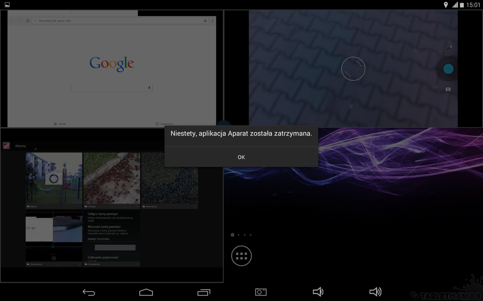 Przedni aparat to niższa półka i polecam używać go tylko… właściwie to nie polecam go używać wcale, jeśli nie chcemy popsuć sobie humoru. Oliwy do ognia dodaje fakt, że aplikacja obsługująca aparat jest bardzo niestabilna i często zacina się lub po prostu wyłącza informując przy tym bardzo kulturalnie, że „Aplikacja aparatu została zatrzymana”…