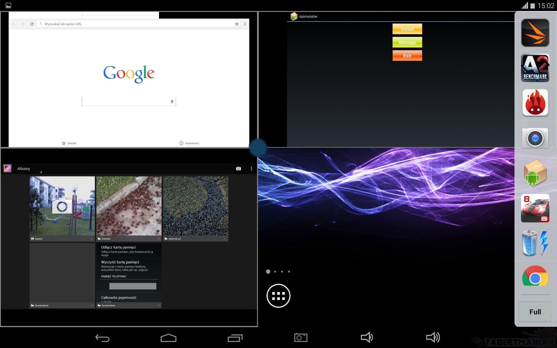 Tablet pracuje pod kontrolą Androida w wersji 4.4.2, w czystej postaci. Interfejs działa bardzo płynnie i stabilnie, tak samo jak systemowe i właściwie wszystkie zewnętrzne aplikacje. Producent dodaje od siebie kilka funkcji, takich jak zestaw praktycznych widgetów i aplikację umożliwiającą otwieranie programów w oknach. Jest ona niemal identyczna z tą, którą znamy z urządzeń Samsunga, ale przez jej małą stabilność i ograniczenie możliwości skalowania pojedynczych okienek, jest dużo mniej praktyczna.