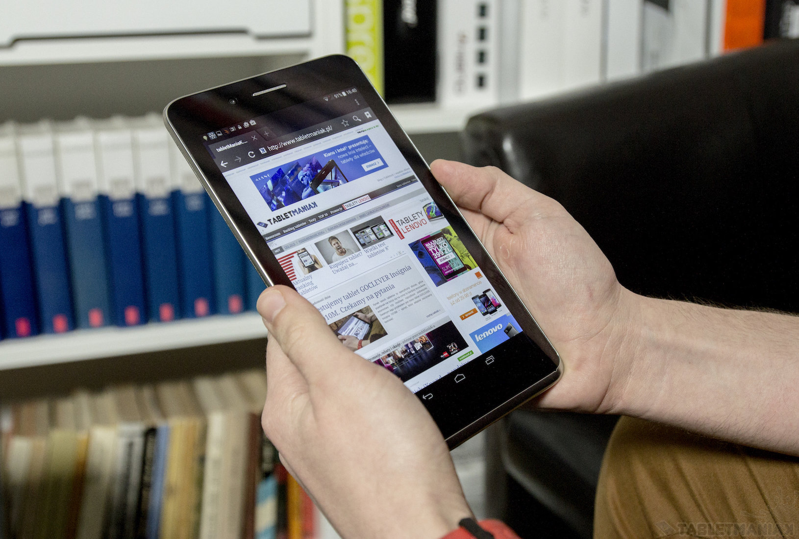 Tablet posiada bardzo kompaktową obudowę, która – trzeba przyznać – jest ładna i estetycznie wykonana. Urządzenie świetnie leży w dłoni – możemy bez żadnych przeszkód trzymać je wyłącznie w jednej ręce. Frontowa część tabletu została zaprojektowana z pomysłem (choć nie będę rozwodzić się nad tym, skąd wzięto „inspirację” – zaciekawionych odsyłam do testu Lenovo S5000). Wokół 7-calowego ekranu biegną szerokie ramki (dużo grubsze, niż w wypadku na przykład Samsunga Galaxy Tab 4 7.0), co przekłada się na większy – w mojej opinii – komfort korzystania z tabletu: możemy swobodnie ułożyć palce przy wyświetlaczu nie bojąc się o to, że go omyłkowo dotkniemy. Moją sympatię zdobył pomysł pokrycia całego frontu szkłem, które spotyka się na krawędziach z plastikowym łączeniem.