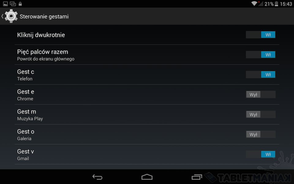 Sterowanie gestami — chyba najbardziej przydatna opcja ze wszystkich, za pośrednictwem której będziemy mogli na przykład uaktywnić tablet poprzez podwójne puknięcie palcem w ekran. Działa wyśmienicie. Możemy też uszczypnąć ekran używając pięciu palców, aby wyjść do ekranu głównego (prawie jak Apple 😉 ).