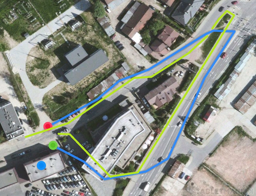 Bluetooth działa w standardzie 4.0 EDR i sprawuje się bez zarzutu. Urządzenie posiada także moduł GPS – pierwszego fixa tablet złapał po około 2 minutach, niestety zapis trasy nieco odbiega od rzeczywistości (na niebiesko zaznaczona trasa zarejestrowana przy pomocy GPS, na zielono rzeczywista droga).