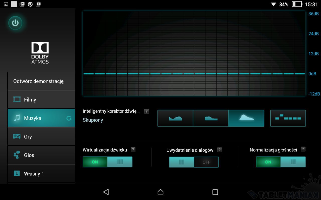 Brzmienie głośników wspomaga technologia Dolby Atmos. Za pomocą specjalnej aplikacji możemy dostosować profile dźwiękowe w zależności od odtwarzanych multimediów — do filmu, muzyki, gry, a także spersonalizować dwa własne. Dalsze ustawienia pozwalają na normalizację brzmienia, uwydatnienie dialogów i wirtualizację dźwięku.