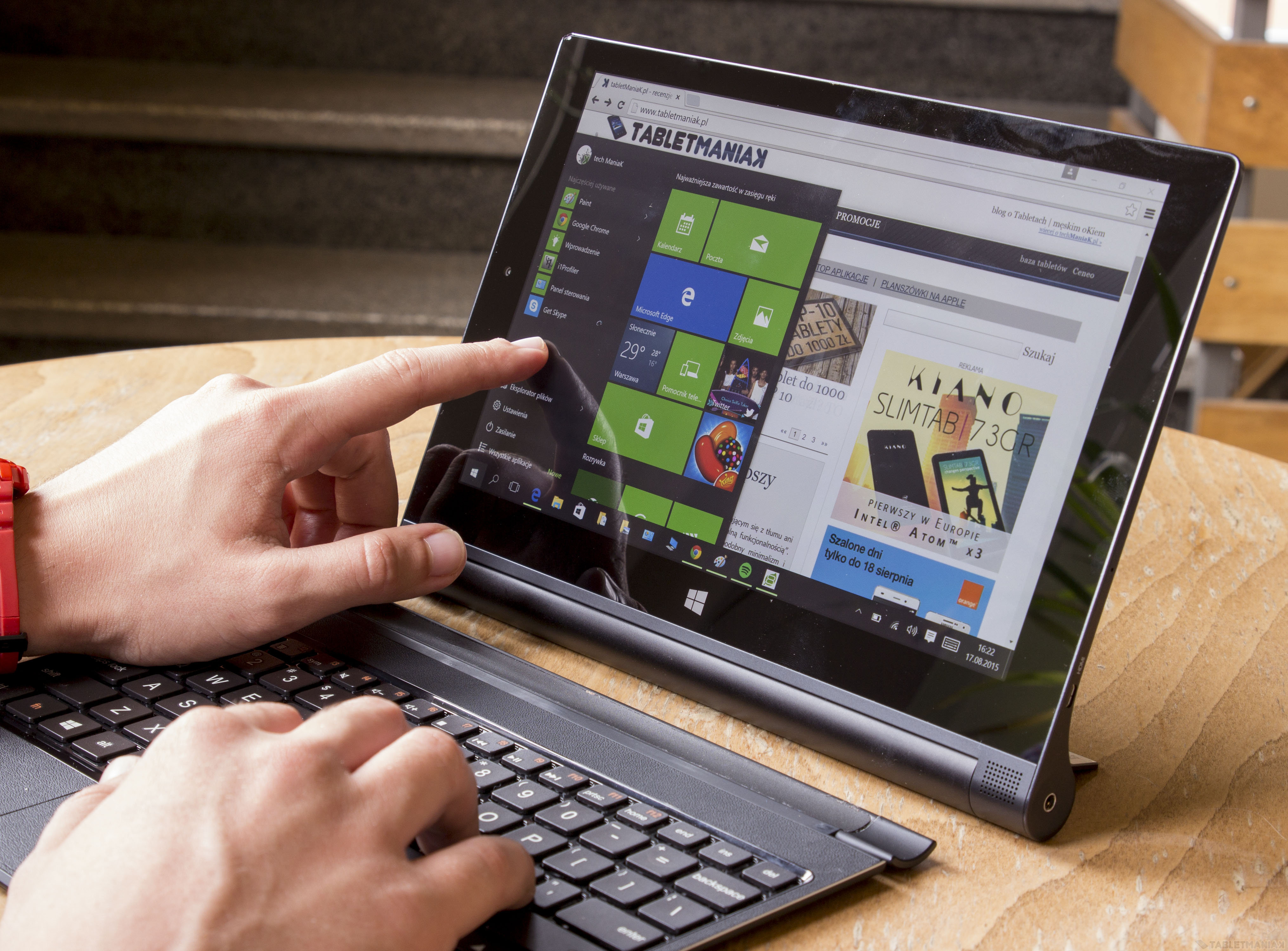 Sytuacja ma się znacznie lepiej, kiedy kupujemy zestaw o cenie przekraczającej 1000 zł. Modelem, który nasuwa mi się na myśl jest oczywiscie Lenovo Yoga Tablet 2 1051L z Windowsem 10. To urządzenie będące niezależnym tabletem — posiada wbudowaną podstawkę do ustawienia z pozycji stojącej, a dołączona do zestawu klawiatura doczepiana jest za pomocą magnesu. Taki pomysł bardzo mi się podoba, bo pozwala szybko odłączyć jedno od drugiego.