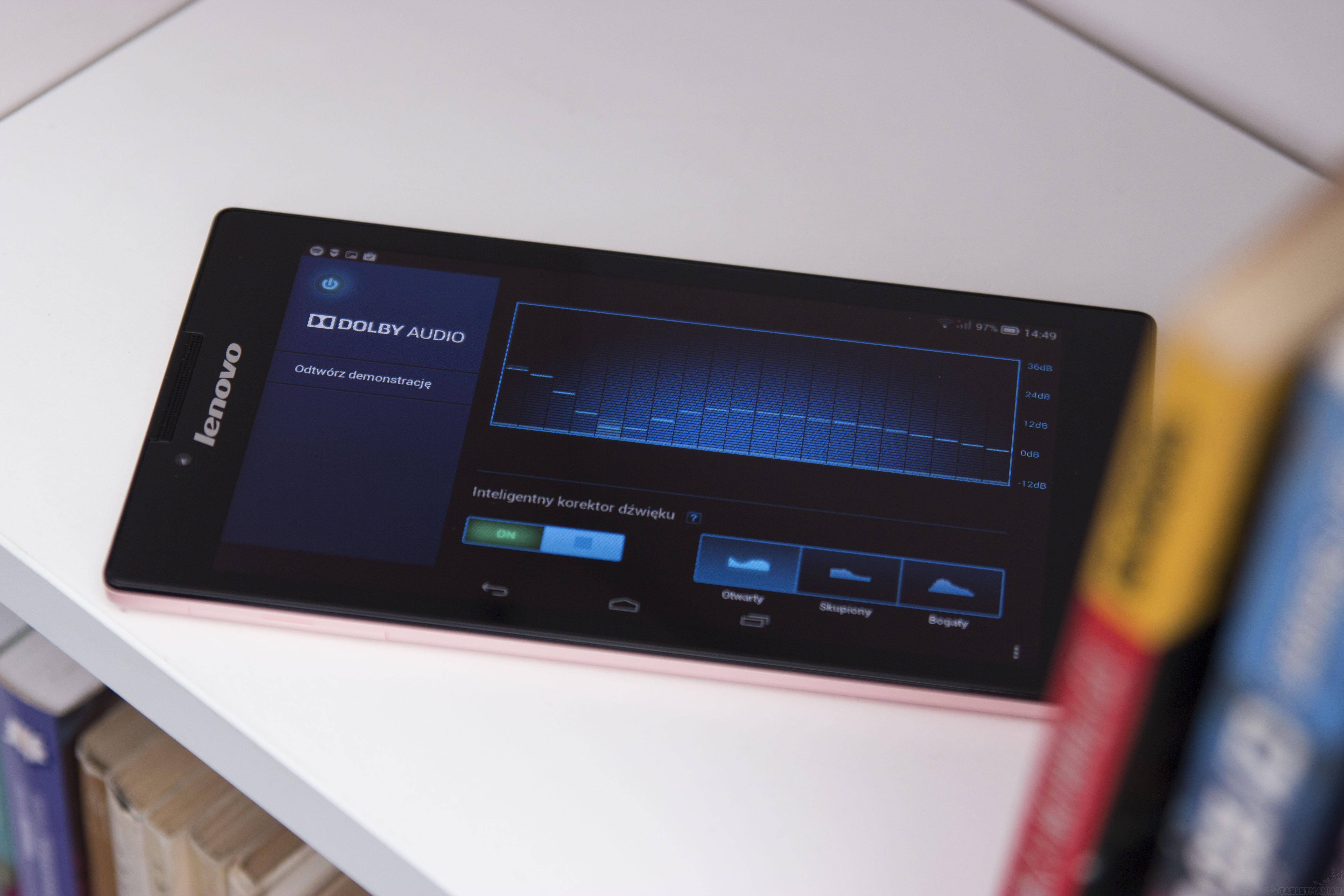 Jak już wspomniałem kilka akapitów wyżej, tablet posiada dwa głośniki zamontowane na frontowej części, które otrzymały certyfikat Dolby — takie logo dumnie widnieje na tylnej części tabletu. Byłem bardzo zadowolony z jakości odtwarzanej na tablecie muzyki. Głośniki grają głośno (77 dB) i czysto, a dodatkowo możemy poprawić brzmienie przy użyciu specjalnego oprogramowania oferującego bogaty korektor graficzny.