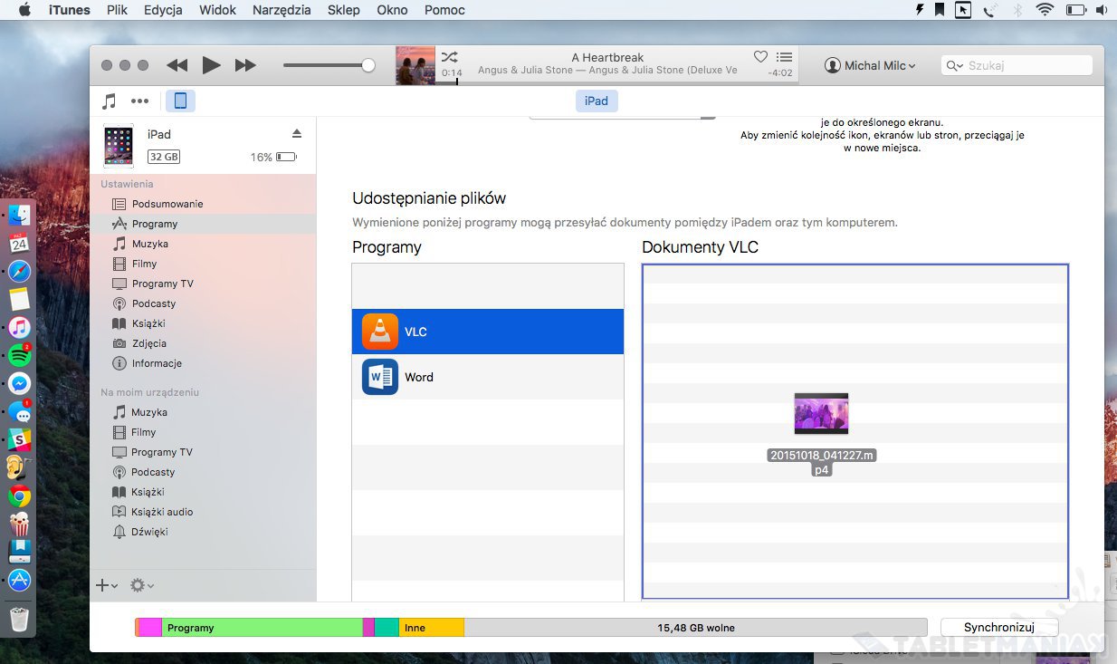 Uwaga — najpierw zainstaluj program na iPadzie, potem synchronizuj jego zawartość. Dla przykładu kup w AppStorze program VLC i przygotuj własny plik wideo.