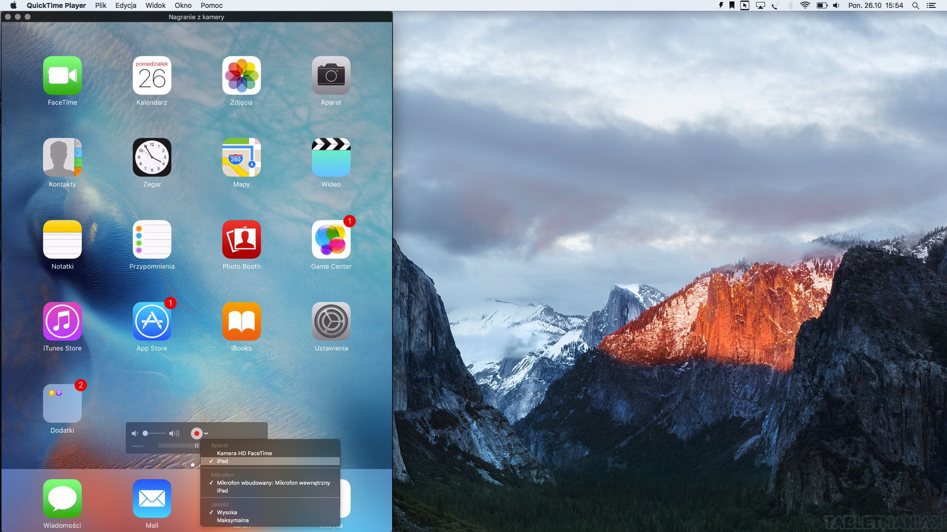 Istnieją dwa sposoby — bezpieczniejszy i mniej bezpieczny. Jeśli posiadasz aktualne oprogramowanie oraz Quick Time Player, podłącz iPada do komputera, uruchom Quick Time Player, a następnie kliknij Plik -> Nowe nagranie filmowe, a następnie z opcji Źródło wybierz iPad.